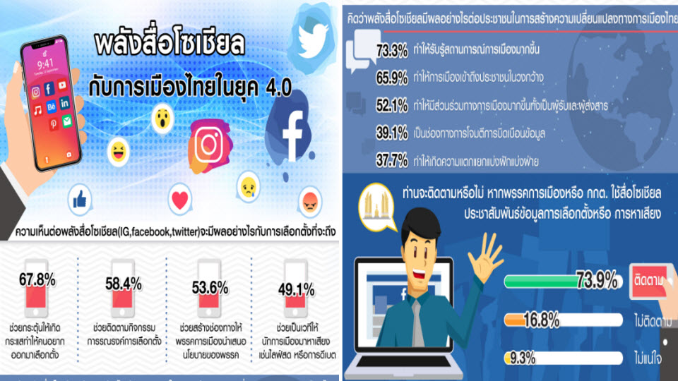เมื่อถามว่าพลังสื่อโซเชียลมีผลอย่างไรต่อประชาชน ในการสร้างความเปลี่ยนแปลงทางการเมืองไทย ส่วนใหญ่ ร้อยละ 73.3 เห็นว่า ทำให้รับรู้สถานการณ์การเมืองมากขึ้น รองลงมา ร้อยละ 65.9 ทำให้การเมืองเข้าถึงประชาชนในวงกว้าง และร้อยละ 52.1 ทำให้มีส่วนร่วมทางการเมืองมากขึ้น ทั้งเป็นผู้รับและผู้ส่งสาร