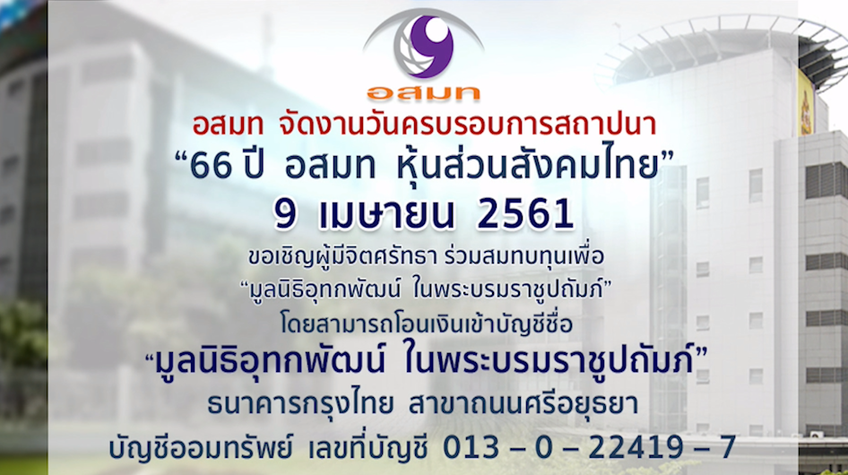 กทม. 24 มี.ค.-อสมท เตรียมจัดกิจกรรมเนื่องในโอกาสครบรอบการสถาปนา 66 ปี วันที่ 9 เมษายน 2561ภายใต้ชื่องาน “66 ปี อสมท หุ้นส่วนสังคมไทย” โดยขอเชิญชวนผู้มีจิตศรัทธาร่วมสมทบทุนเพื่อ “มูลนิธิอุทกพัฒน์ ในพระบรมราชูปถัมภ์” โดยสามารถโอนเงินเข้าบัญชีชื่อ “มูลนิธิอุทกพัฒน์ ในพระบรมราชูปถัมภ์” ธ.กรุงไทย สาขาถนนศรีอยุธยา บัญชีออมทรัพย์ เลขที่บัญชี 013-0-22419-7.-สำนักข่าวไทย