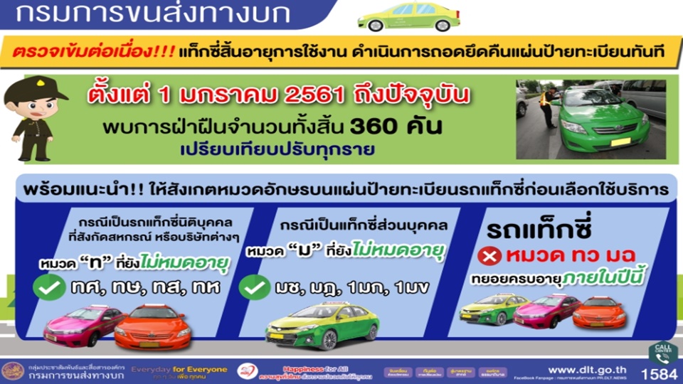 ทั้งนี้ ตั้งแต่วันที่ 1 มกราคม 2561 ถึงปัจจุบัน มีการฝ่าฝืน 360 คัน จึงสั่งทุกหน่วยตรวจสอบเข้มข้นและบังคับใช้กฎหมายขั้นสูงสุดเด็ดขาด พร้อมขอความร่วมมือสำนักงานตำรวจแห่งชาติ (สตช.) เข้มงวดตรวจสอบและจับกุมแท็กซี่สิ้นอายุการใช้งาน เนื่องจากกฎหมายกำหนดอายุการใช้งานแท็กซี่ไม่เกิน 9 ปี นับแต่วันจดทะเบียนครั้งแรกเท่านั้น เมื่อครบอายุการใช้งานต้องรีบส่งคืนแผ่นป้ายทะเบียนและใบคู่มือจดทะเบียนรถ เพื่อแจ้งระงับทะเบียนภายใน 30 วัน นับแต่วันที่ครบอายุการใช้งาน ถอดอุปกรณ์ส่วนควบของรถแท็กซี่ เช่น โป๊ะไฟ มิเตอร์ และห้ามนำไปใช้รับจ้างรับ-ส่งผู้โดยสารเด็ดขาด หากต้องการใช้รถเพื่อการส่วนตัวต้องแจ้งเปลี่ยนประเภทจดทะเบียนเป็นรถยนต์นั่งส่วนบุคคลห้ามนำมารับจ้าง เพื่อเป็นการคุ้มครองประชาชนที่ใช้บริการรถแท็กซี่ในการเดินทางให้ได้รับบริการที่ดีและปลอดภัย