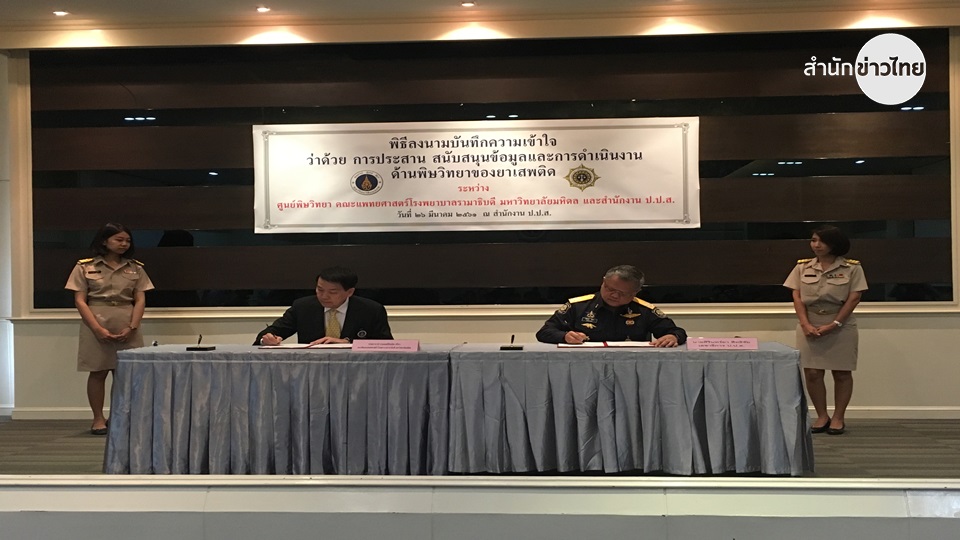 นายศิรินทร์ยา สิทธิชัย เลขาธิการคณะกรรมการป้องกันและปราบปรามยาเสพติด (เลขาธิการ ป.ป.ส.) และ ศ.นพ.ปิยะมิตร ศรีธรา คณบดีคณะแพทยศาสตร์ โรงพยาบาลรามาธิบดี ร่วมลงนามในบันทึกข้อตกลงว่าด้วย การประสาน สนับสนุนข้อมูลและการดำเนินงานด้านพิษวิทยาของยาเสพติด ระหว่างหน่วยงานหลักด้านนโยบายและยุทธศาสตร์ยาเสพติดกับหน่วยงานทางวิชาการและการปฏิบัติการที่มีความเชี่ยวชาญเฉพาะด้านเกี่ยวกับพิษวิทยาเพื่อประโยชน์ด้านองค์ความรู้ ข้อมูลข่าวสารที่ถูกต้อง ของยาเสพติด สารเสพติด สารเคมี วัตถุออกฤทธิ์ต่อจิตและประสาท
