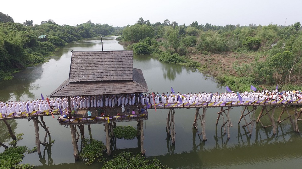 มหาสารคาม 28 มี.ค.- ช้าง 10 เชือกนำขบวนนาคแห่ข้ามสะพานไม้วัดเกาะเกิ้ง สะพานอันซีนของเมืองมหาสารคาม เพื่ออุปสมบทหมู่ถวายพระราชกุศล วันคล้ายวันพระราชสมภพ 2 เม.ย.