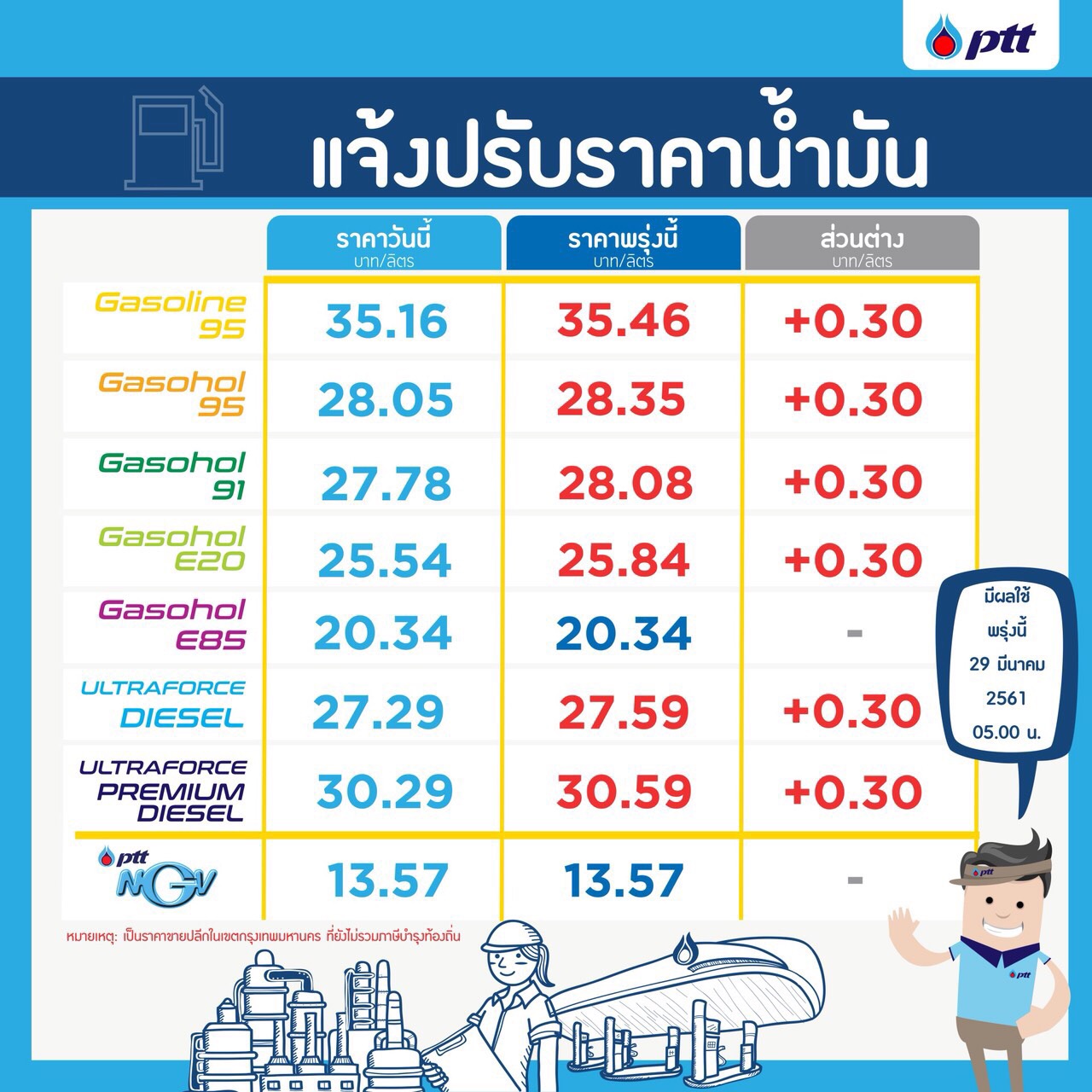 กรุงเทพฯ 28 มี.ค. – ปตท.-บางจากฯ แจ้งปรับราคาน้ำมันขึ้นทุกชนิด 30 สต./ลิตร ยกเว้น E85 คงเดิม มีผล 29 มี.ค.นี้