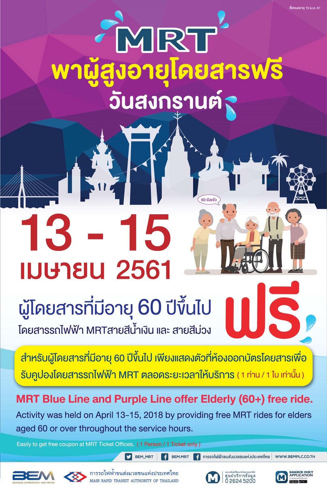 การรถไฟฟ้าขนส่งมวลชนแห่งประเทศไทย (รฟม.) เตรียมพร้อมอำนวยความสะดวกและปลอดภัยให้แก่ผู้ใช้บริการรถไฟฟ้า MRT ทั้ง 2 สาย ได้แก่ รถไฟฟ้ามหานคร สายเฉลิมรัชมงคล (รถไฟฟ้า MRT สายสีน้ำเงิน) และรถไฟฟ้ามหานคร สายฉลองรัชธรรม (รถไฟฟ้า MRT สายสีม่วง) ตามนโยบายกระทรวงคมนาคมที่กำหนดมาตรการเข้มข้น 777 (ระหว่างวันที่ 4 – 24 เมษายน 2561) เพื่อรองรับการเดินทางของประชาชนในช่วงเทศกาลสงกรานต์ 2561 โดย รฟม. จะยกเว้นค่าโดยสารรถไฟฟ้า MRT ทั้ง 2 สาย ให้แก่ผู้โดยสารที่มีอายุตั้งแต่ 60 ปีบริบูรณ์ขึ้นไป ในวันสงกรานต์และวันผู้สูงอายุแห่งชาติ ระหว่างวันที่ 13 – 15 เมษายน 2561 ตลอดระยะเวลาเปิดให้บริการ โดยแสดงตัวที่ห้องออกบัตรโดยสารพร้อมบัตรประชาชน เพื่อรับคูปอง 1 ใบ (1 คนต่อคูปอง 1 ใบเท่านั้น) สำหรับผ่านเข้า – ออกประตูพิเศษ (Swing Gate) เพื่อเข้าระบบต่อไป