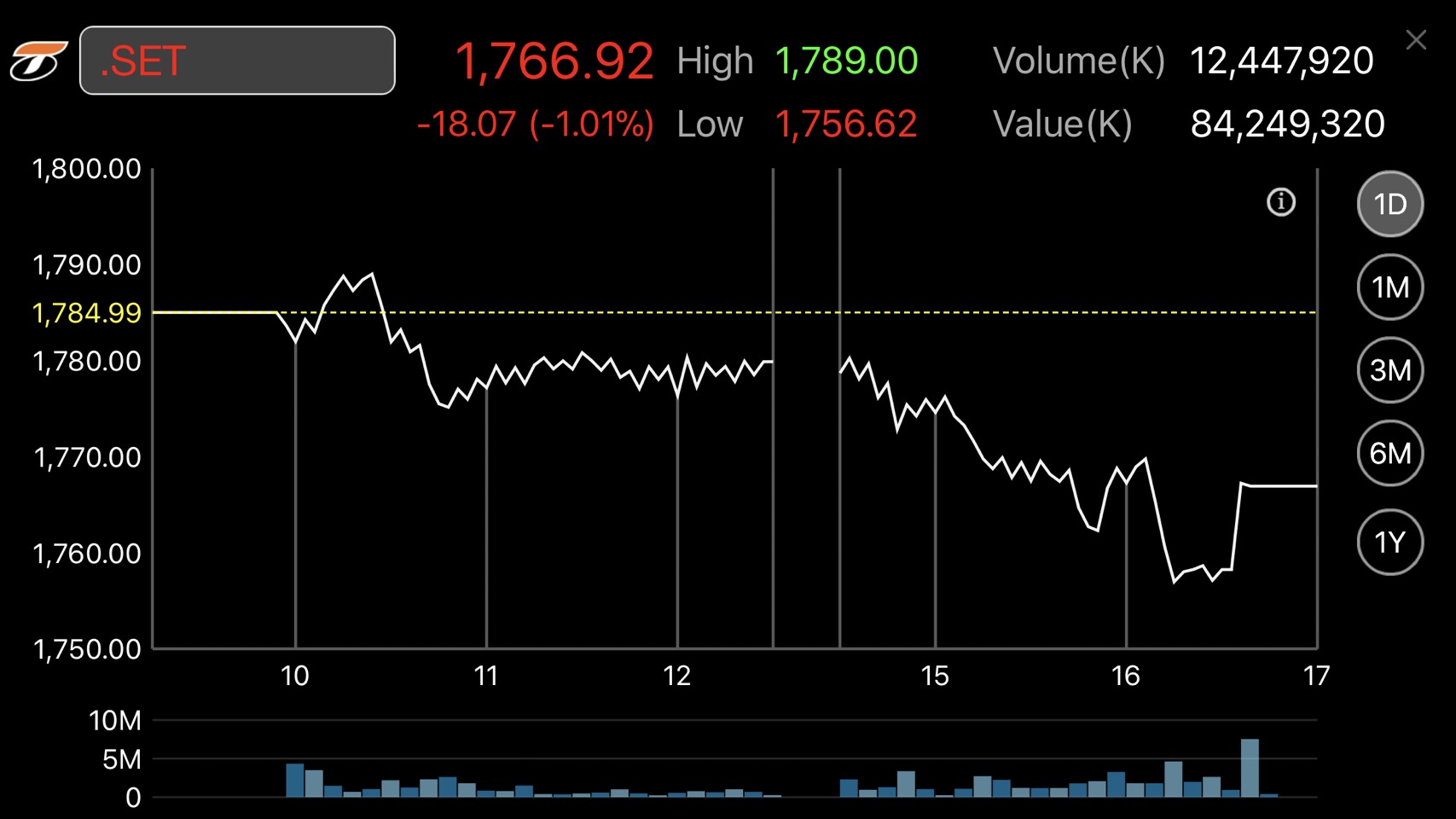 การซื้อขายหุ้นวันนี้ ดัชนีหุ้นไทยเคลื่อนไหวในแดนลบเป็นส่วนใหญ่ โดยดัชนีฯแตะจุดสูงสุดที่ 1,789.00 จุด และแตะจุดต่ำสุดที่ระดับ 1,756.62 จุด