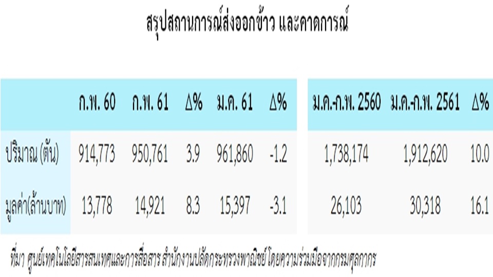ทั้งนี้ การส่งออกข้าวเดือนกุมภาพันธ์ 2561 มีปริมาณ 950,761 ตัน มูลค่า 14,921 ล้านบาท โดยปริมาณส่งออกลดลงร้อยละ 1.2 และมูลค่าลดลงร้อยละ 3.1 เมื่อเทียบกับเดือนมกราคม 2561 ที่มีการส่งออกปริมาณ 961,859 ตัน มูลค่า 15,397 ล้านบาท เนื่องจากเดือนกุมภาพันธ์มีการส่งออกข้าวหอมมะลิและข้าวนึ่งลดลงจากเดือนก่อน เนื่องจากคำสั่งซื้อข้าวจากต่างประเทศมีปริมาณลดลงจากการที่ราคาข้าวไทยยังคงอยู่ในระดับสูง ซึ่งเป็นผลมาจากค่าเงินบาทที่ยังคงแข็งค่า ประกอบกับผู้ซื้อบางส่วนชะลอการซื้อข้าวเนื่องจากเป็นช่วงที่มีการเก็บเกี่ยวข้าวฤดูใหม่ของประเทศในแถบเอเชียตะวันออกเฉียงใต้ ซึ่งตามปกติราคาข้าวจะมีแนวโน้มอ่อนตัวลง โดยเดือนกุมภาพันธ์มีการส่งออกข้าวขาวปริมาณรวม 505,915 ตัน เพิ่มขึ้นร้อยละ 10.6 เมื่อเทียบกับเดือนมกราคม โดยส่วนใหญ่ส่งไปประเทศฟิลิปปินส์ อินโดนีเซีย เบนิน แองโกล่า โมซัมบิก มาเลเซีย โตโก เป็นต้น ขณะที่การส่งออกข้าวนึ่งมีปริมาณ 308,999 ตัน ลดลงร้อยละ 18.7 เมื่อเทียบกับเดือนกุมภาพันธ์ โดยตลาดหลักยังคงเป็นประเทศเบนิน แอฟริกาใต้ เยเมน บังคลาเทศ เป็นต้น ส่วนการส่งออกข้าวหอมมะลิมีปริมาณ 113,822 ตัน ลดลงร้อยละ 9.9 เมื่อเทียบกับเดือนกุมภาพันธ์ โดยส่วนใหญ่ส่งไปประเทศสหรัฐอเมริกา จีน ฮ่องกง เป็นต้น