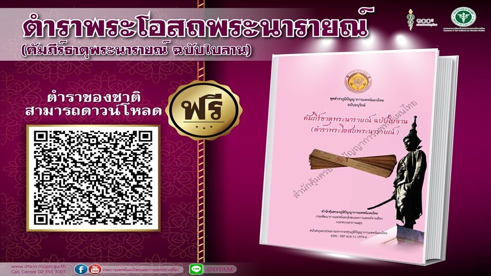 รัฐมนตรีว่าการกระทรวงสาธารณสุขได้ลงนามประกาศให้คัมภีร์พระโอสถพระนารายณ์ หรือคัมภีร์ธาตุพระนารายณ์ เป็นตำราการแพทย์แผนไทยของชาติ และตำรับยาในคัมภีร์เป็นตำรับยาแผนไทยของชาติ มีการสังเคราะห์และแปลให้เป็นภาษาที่อ่านเข้าใจง่าย ประชาชนทั่วไปสามารถดาวน์โหลดตำราโอสถพระนารายณ์ได้ฟรีที่เว็บไซต์กองคุ้มครองและส่งเสริมภูมิปัญญาการแพทย์แผนไทยและแพทย์พื้นบ้านไทย กรมการแพทย์แผนไทยและการแพทย์ทางเลือก http://ptmk.dtam.moph.go.th/home.php เพื่อใช้ในการศึกษา ต่อยอดองค์ความรู้ด้านการแพทย์แผนไทยในการดูแลสุขภาพโดยไม่เสียค่าธรรมเนียมใดๆ ยกเว้นกรณีใช้เพื่อการค้าต้องมีการขออนุญาตจากกรมการแพทย์แผนไทยฯ โดยจะต้องตอบแทนผลประโยชน์ให้ประเทศชาติในอัตราร้อยละ 3 รายละเอียดเพิ่มเติมสอบถามที่หมายเลขโทรศัพท์ 0-2149-5607-8 .-สำนักข่าวไทย