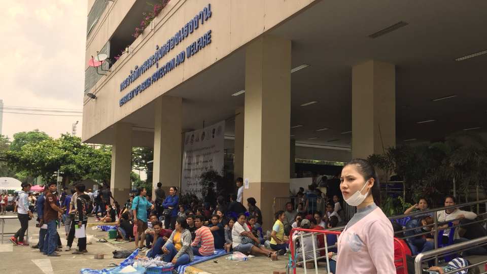 บรรยากาศศูนย์บริการเบ็ดเสร็จ หรือ OSS ที่บริเวณใต้อาคารกระทรวงแรงงาน แม้จะเปิดให้บริการตลอด 24 ชั่วโมง แต่แรงงานกัมพูชา เมียนมา และลาว นับพันคนต่างนอน นั่ง และยืนรอต่อคิวขึ้นทะเบียนประวัติที่ศูนย์อย่างเนืองแน่น จนล้นออกมาด้านนอก และเนื่องจากอากาศช่วงเที่ยงวันนี้ร้อนจัด ทำให้แรงงานบางคนเกิดอาการชักและเป็นลม จนต้องนำส่งโรงพยาบาล