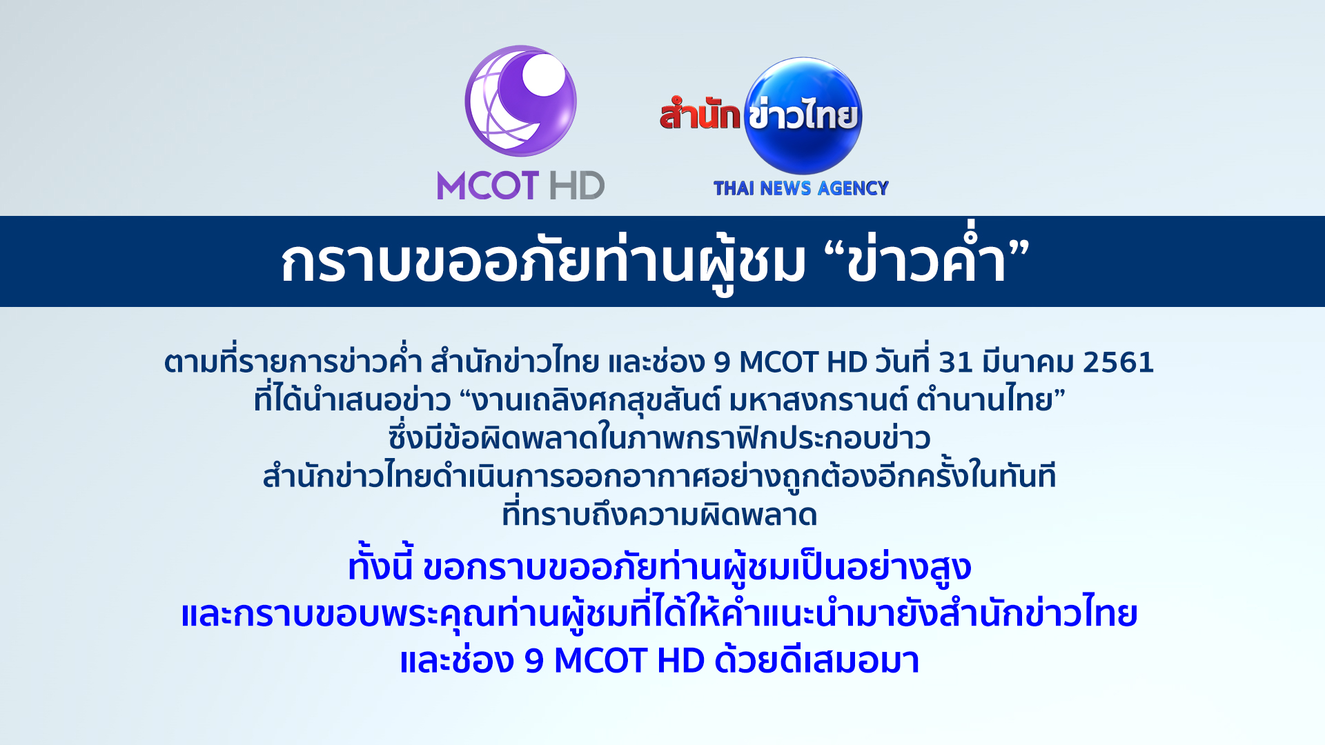 ทั้งนี้ ขอกราบขออภัยท่านผู้ชมเป็นอย่างสูง และกราบขอบพระคุณท่านผู้ชมที่ได้ให้คำแนะนำมายังสำนักข่าวไทย และช่อง 9 MCOT HD ด้วยดีเสมอมา.