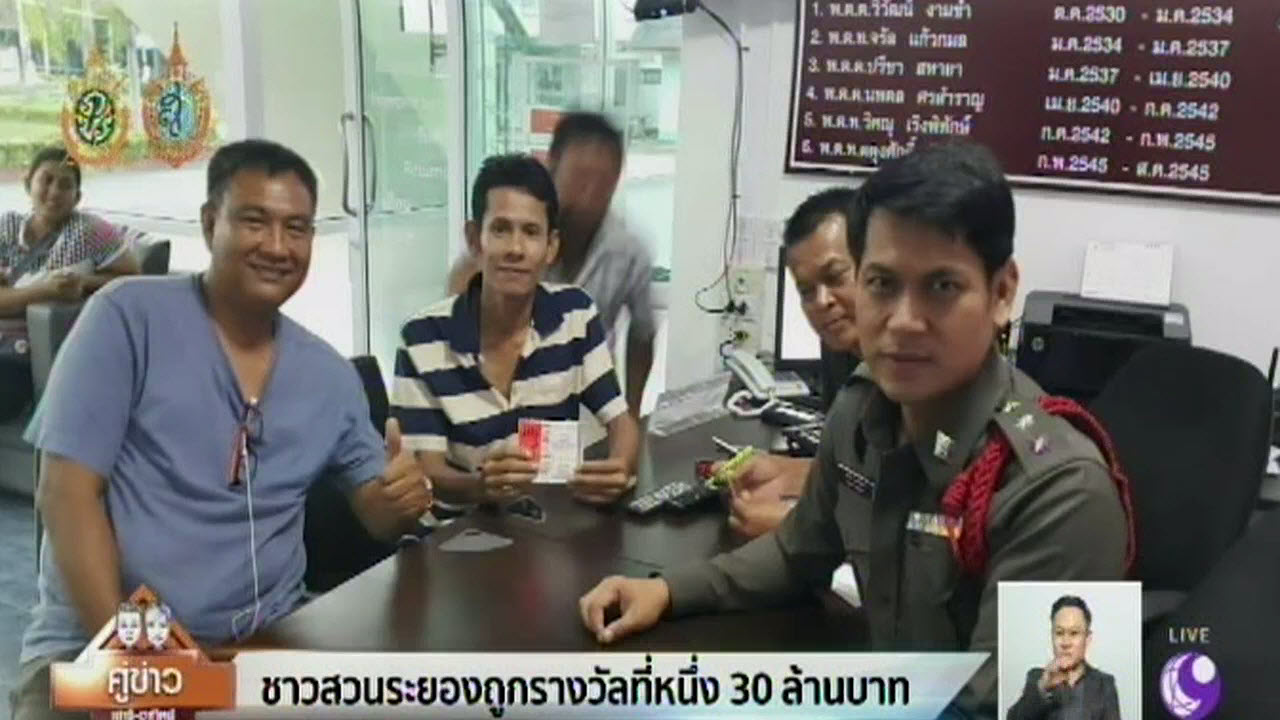 ระยอง 2 ต.ค.-ชาวสวนผลไม้ระยองเฮง ถูกรางวัลที่ 1 รับเงิน 30 ล้านบาท สลากรางวัล 5 คู่ ซึ่งแต่ละคู่คือหมายเลข 887102 หรือรางวัลที่ 1 ประจำงวดวันที่ 1 ตุลาคม 2559 หรือหวยงวดเมื่อวานนี้ ซึ่ง 5 คู่รวมรางวัลที่จะได้รับประมาณ 30 ล้านบาท เจ้าของจึงรีบนำไปเป็นหลักฐานลงบันทึกประจำวันที่ สภ.ปากน้ำประแสร์ อ.แกลง จ.ระยอง