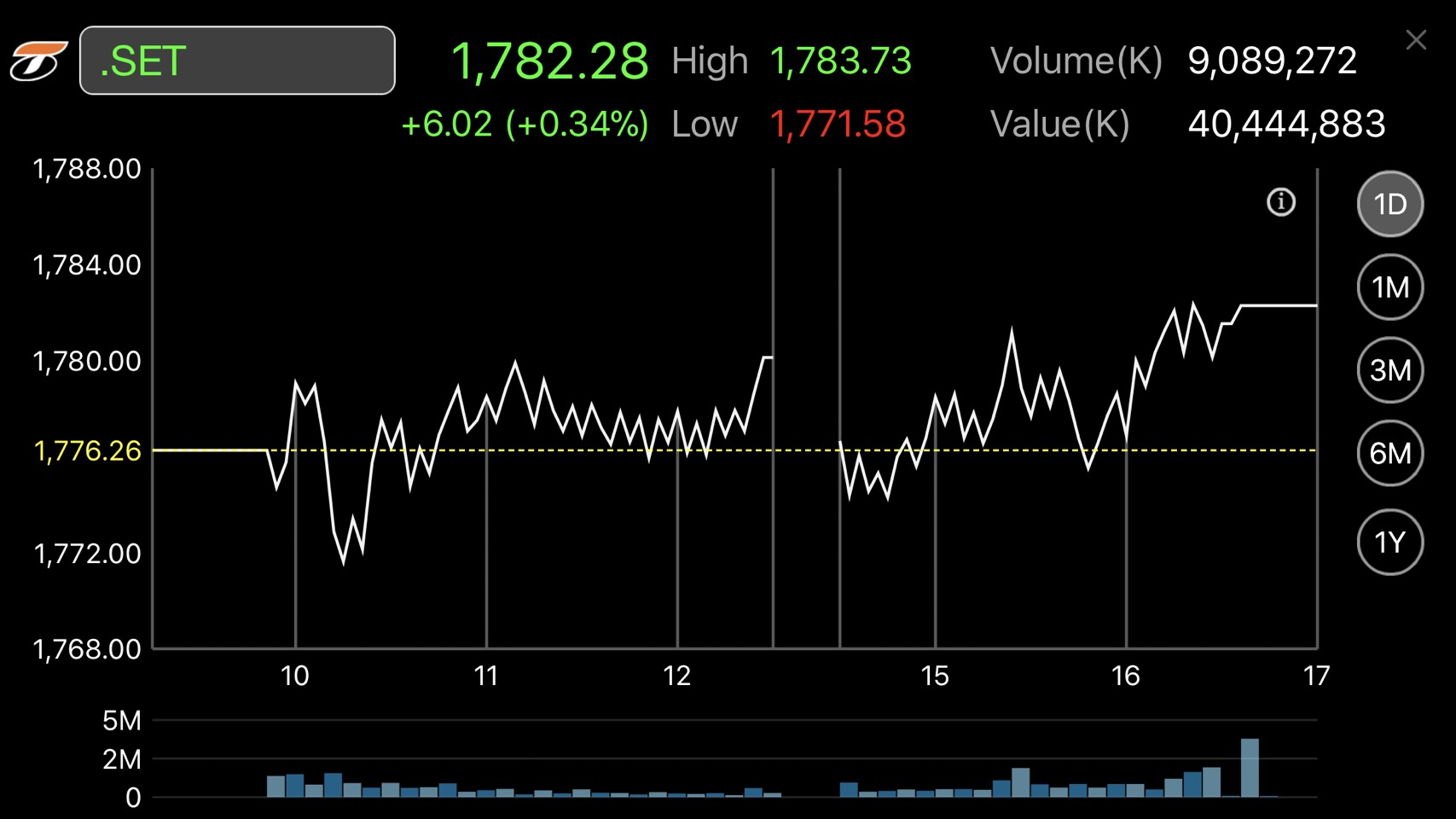 ผู้สื่อข่าวรายงานว่าดัชนีตลาดหลักทรัพย์ปิดที่ระดับ 1,782.28 จุด เพิ่มขึ้น 6.02 จุด หรือร้อยละ 0.34 มูลค่าการซื้อขาย 40,444.88 ล้านบาท การซื้อขายหุ้นวันนี้ (2 เม.ย.) ดัชนีหุ้นไทยเคลื่อนไหวทั้งแดนบวก-ลบ โดยดัชนีฯ แตะจุดสูงสุดที่ 1,783.73 จุด และต่ำสุดที่ระดับ 1,771.58 จุด