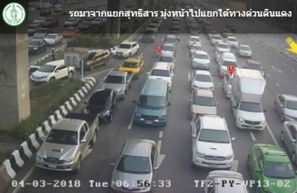 ถนนวิภาวดี-รังสิต ขาเข้า มุ่งหน้าแยกใต้ด่วนดินแดง จราจรติดขัด ท้ายสะสมหน้าโรงเรียนสุรศักดิ์มนตรี.-สำนักข่าวไทย