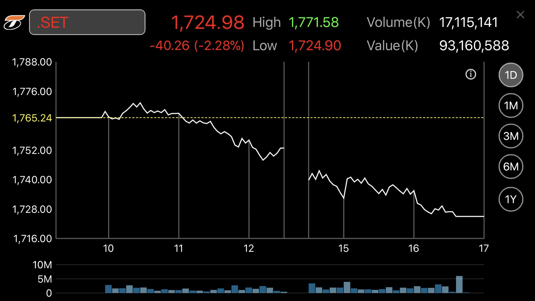 ผู้สื่อข่าวรายงานว่าดัชนีตลาดหลักทรัพย์ฯ ปิดการซื้อขายที่ระดับ 1,724.98 จุด ลดลง 40.26 จุด หรือร้อยละ 2.28 มูลค่าการซื้อขาย 93,160.59 ล้านบาท การซื้อขายหุ้นไทยวันนี้ (4 เม.ย.) ดัชนีเคลื่อนไหวในแดนบวกเพียงสั้น ๆ จากนั้นก็ปรับตัวลดลง โดยเฉพาะภาคบ่ายดัชนีไหลลงแรง เนื่องจากมีแรงขายในหุ้นขนาดใหญ่ เช่น PTT KBANK BBL โดยดัชนีลดลงต่ำสุดที่ 1,724.90 จุด และสูงสุดของวันที่ 1,771.58 จุด