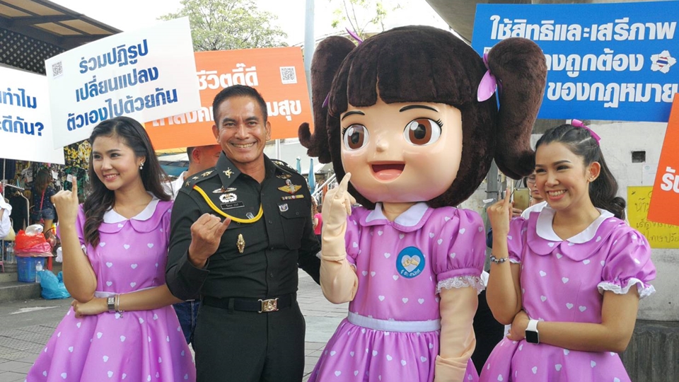 จากนั้น พ.อ.วันชนะ นำน้องเกี่ยวก้อย พร้อมทีมพรีเซ็นเตอร์ เดินแจกสัญญาประชาคมฉบับย่อให้แก่ประชาชนและนักท่องเที่ยว บริเวณสกายวอล์คโดยรอบอนุสาวรีย์ชัยสมรภูมิ.-สำนักข่าวไทย