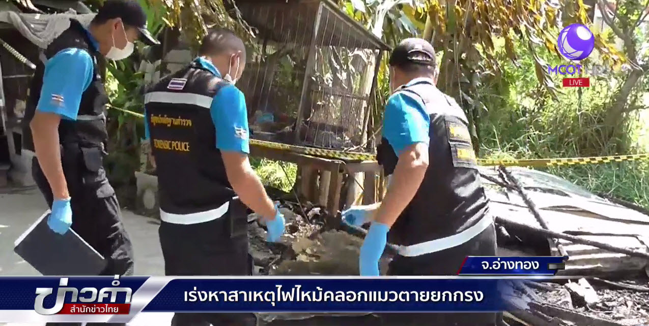 ตำรวจพิสูจน์หลักฐาน กองบังคับการตำรวจภูธรจังหวัดอ่างทอง พร้อมด้วยตำรวจภูธรเมืองอ่างทอง ลงพื้นที่บริเวณบ้านเลขที่ 20/8 ม.8 ต.โพสะ อ.เมือง จ.อ่างทอง ซึ่งเป็นบ้านของนางสุนันทา บัวทอง อายุ 60 ปี หลังจากเมื่อคืนที่ผ่านมาเกิดเหตุเพลิงไหม้กรงเลี้ยงแมวพันธุ์เปอร์เซีย และพันธุ์สีสวาด ซึ่งอยู่บริเวณด้านหน้าตัวบ้าน ทำให้แมวและลูกแมว 8 ตัวถูกไฟคลอกตายทั้งหมด
