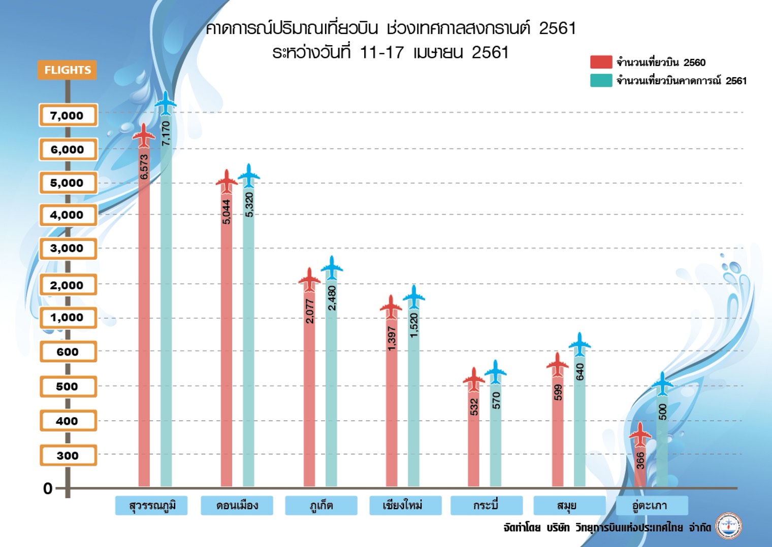 นางสาริณี อังศุสิงห์ กรรมการผู้อำนวยการใหญ่ บริษัท วิทยุการบินแห่งประเทศไทย จำกัด เปิดเผยว่า ในช่วงเทศกาลสงกรานต์ของทุกปี เป็นช่วงเวลาที่มีวันหยุดยาวต่อเนื่องติดต่อกันมีนักท่องเที่ยวทั้งในและต่างประเทศเดินทางมาประเทศไทยจำนวนมาก ส่งผลให้ปริมาณเที่ยวบินในช่วงดังกล่าวมีปริมาณเพิ่มสูงขึ้นจากปกติ เพื่ออำนวยความสะดวกผู้โดยสารและอากาศยาน วิทยุการบินฯ จึงเตรียมมาตรการรองรับปริมาณเที่ยวบินที่เพิ่มขึ้น ซึ่งจากการประมาณการปริมาณเที่ยวบินทั้งภายในและระหว่างประเทศที่เข้า-ออก ณ ท่าอากาศยานหลักทั่วประเทศ ในช่วงระหว่างวันที่ 11-17 เมษายน 2561 รวม 19,100 เที่ยวบิน และมีเที่ยวบินที่ขอเพิ่มพิเศษในช่วงเทศกาลสงกรานต์ปี 2561 ทั้งสิ้น 182 เที่ยวบิน คาดว่าจะมีปริมาณเที่ยวบินทั่วประเทศเพิ่มขึ้นจากปีที่แล้ว 1,888 เที่ยวบิน หรือคิดเป็นร้อยละ 11 เมื่อเทียบกับช่วงเวลาเดียวกันของปีที่ผ่านมา