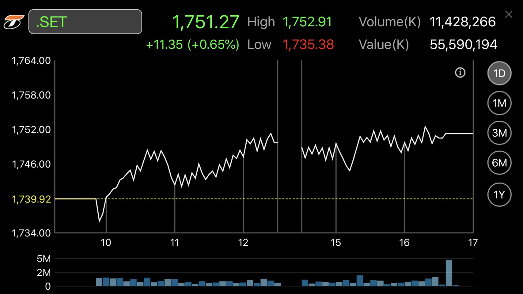 ผู้สื่อข่าวรายงานว่าดัชนีตลาดหลักทรัพย์ฯ ปิดที่ระดับ 1,751.27 จุด เพิ่มขึ้น 11.35 จุด หรือร้อยละ 0.65 มูลค่าการซื้อขาย 55,590.19 ล้านบาท การซื้อขายหุ้นวันนี้ (9 เม.ย.) ดัชนีหุ้นไทยเคลื่อนไหวแดนบวกเป็นส่วนใหญ่ โดยดัชนีฯ แตะจุดสูงสุดที่ 1,752.91 จุด และแตะจุดต่ำสุดที่ระดับ 1,735.38 จุด