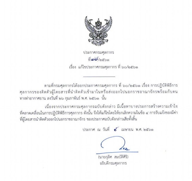 นายกุลิศ สมบัติศิริ อธิบดีกรมศุลกากร ลงนามประกาศยกเลิกการรับแจ้งเรื่องการนำของมีค่าที่ผู้โดยสารติดตัวออกนอกราชอาณาจักร เนื่องจากสร้างความเข้าใจคลาดเคลื่อนในการปฏิบัติพิธีการศุลกากร ทั้งนี้ ก่อนหน้านี้กรมศุลกากรเคยออกประกาศเมื่อวันที่ 26 กุมภาพันธ์ 2561 ให้นำสิ่งของมีค่าไปแจ้งต่อเจ้าหน้าที่ก่อนไม่เช่นนั้นอาจถูกเรียกเก็บภาษีศุลกากร หลังเดินทางกลับเข้าราชอาณาจักร.-สำนักข่าวไทย