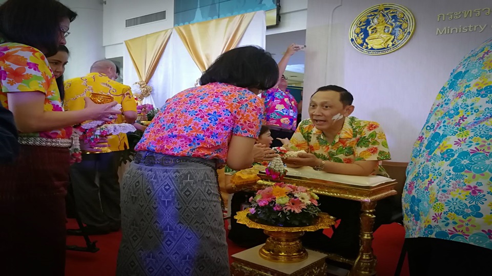 เช้าวันนี้ (11 เม.ย.) ที่กระทรวงการพัฒนาสังคมและความมั่นคงของมนุษย์ (พม.) บริเวณโถงชั้น 1 เนืองแน่นไปด้วยข้าราชการ เจ้าหน้าที่ทุกระดับชั้น สวมใส่เสื้อผ้าลายดอกสีสันสดใส ต่อแถวรดน้ำขอพรจาก พล.อ.อนันตพร กาญจนรัตน์ รัฐมนตรีว่าการกระทรวงการพัฒนาสังคมและความมั่นคงของมนุษย์ ในพิธีรดน้ำขอพร “ลูกประชาบดีสืบสาน…สงกรานต์กตัญญู” เนื่องในประเพณีวันสงกรานต์