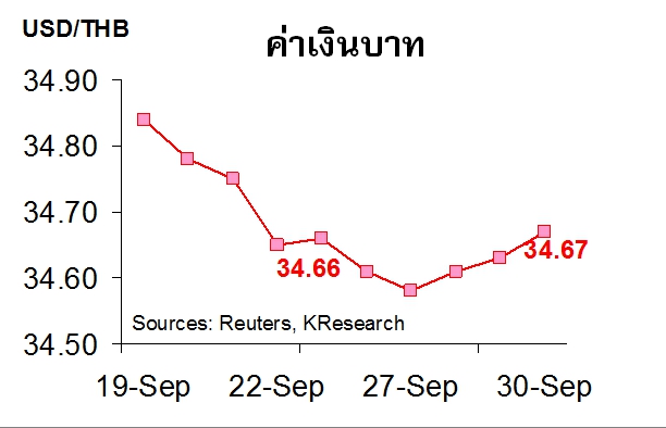 สำหรับสัปดาห์ถัดไป (3-7 ต.ค.) ธนาคารกสิกรไทยประเมินกรอบการเคลื่อนไหวของเงินบาทที่ 34.60-34.90 บาทต่อดอลลาร์ฯ โดยจุดสนใจของตลาดน่าจะยังคงอยู่ที่สัญญาณเกี่ยวกับดอกเบี้ยสหรัฐฯ ถ้อยแถลงของเจ้าหน้าที่เฟด และข้อมูลเศรษฐกิจสหรัฐฯ ที่สำคัญ ได้แก่ ตัวเลขการจ้างงานนอกภาคเกษตร อัตราการว่างงาน ดัชนี PMI ภาคการผลิต/ภาคบริการ รายจ่ายด้านการก่อสร้าง และยอดสั่งซื้อภาคโรงงาน นอกจากนี้ ตลาดอาจมีจุดสนใจเพิ่มเติมที่ปัญหาในภาคธนาคารของเยอรมนี และข้อมูล PMI ของอีกหลายๆ ประเทศด้วยเช่นกัน