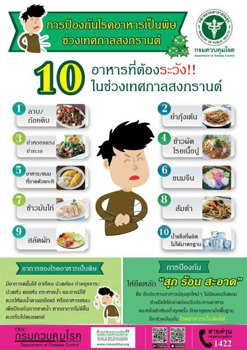 เทศกาลสงกรานต์ ประชาชนจะเฉลิมฉลองด้วยเครื่องดื่มและรับประทานอาหารร่วมกันของคนในครอบครัว ทั้งนี้ อาหารที่ประชาชนควรระมัดระวังเป็นพิเศษ ได้แก่ 1.ลาบ/ก้อยดิบ 2.ยำกุ้งเต้น 3.ยำหอยแครง/ยำทะเล 4.ข้าวผัดโรยเนื้อปู 5.อาหารหรือขนมที่มีส่วนประกอบของกะทิสด 6.ขนมจีน 7.ข้าวมันไก่ 8.ส้มตำ 9.สลัดผัก และ 10.น้ำแข็งที่ผลิตไม่ได้มาตรฐาน รวมถึงหลีกเลี่ยงการปรุงโดยวิธีลวกหรือพล่าสุกๆ ดิบๆ นอกจากนี้ อาหารกล่องควรแยกกับข้าวออกจากข้าว และควรรับประทานภายใน 2- 4 ชั่วโมง หลังจากปรุงเสร็จ และหากมีกลิ่นผิดปกติไม่ควรรับประทาน