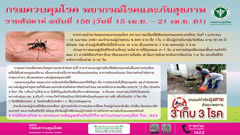 กรมควบคุมโรคร 15 เม.ย.  กรมควบคุมโรครายงาน สถานการณ์โรคไข้เลือดออกวันที่ 1 มกราคม – 12 เมษายน 2561 พบจำนวนผู้ป่วยรวม 6,565 ราย