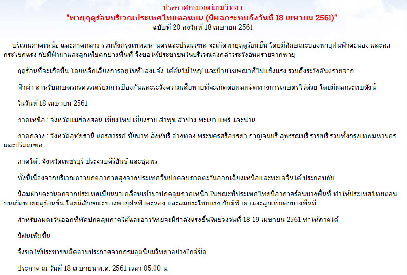 กทม. 18 เม.ย. – กรมอุตุนิยมวิทยาประกาศพายุฤดูร้อนบริเวณประเทศไทยตอนบน มีผลกระทบวันนี้วันสุดท้าย (18 เม.ย.) บริเวณภาคเหนือ และภาคกลาง รวมทั้งกรุงเทพมหานครและปริมณฑล จะเกิดพายุฤดูร้อนขึ้น โดยมีลักษณะของพายุฝนฟ้าคะนอง และลมกระโชกแรง กับมีฟ้าผ่าและลูกเห็บตกบางพื้นที่ ขอให้ประชาชนในบริเวณดังกล่าวระวังอันตรายจากพายุฤดูร้อนที่จะเกิดขึ้น หลีกเลี่ยงการอยู่ในที่โล่งแจ้ง ใต้ต้นไม้ใหญ่ และป้ายโฆษณาที่ไม่แข็งแรง รวมถึงระวังอันตรายจากฟ้าผ่า สำหรับเกษตรกรควรเตรียมการป้องกันและระวังความเสียหายที่จะเกิดต่อผลผลิตทางการเกษตรไว้ด้วย โดยมีผลกระทบดังนี้