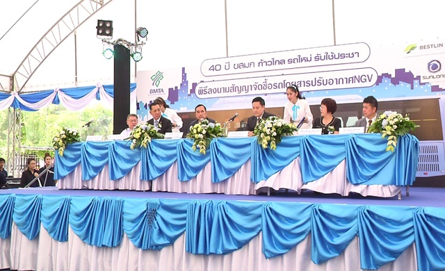 นายออมสิน ชีวะพฤกษ์ รัฐมนตรีช่วยว่าการกระทรวงคมนาคม เป็นประธานในพิธีลงนามสัญญาซื้อขายรถโดยสารปรับอากาศใช้เชื้อเพลิงก๊าซธรรมชาติ (เอ็นจีวี) และพิธีเปิดตัวรถโดยสารตัวอย่างในงานวันคล้ายวันสถาปนาครบรอบ 40 ปี โดยกล่าวว่า การลงนามสัญญาซื้อขายรถโดยสารเอ็นจีวี 489 คัน วงเงิน 3,389 ล้านบาท ระหว่างองค์การขนส่งมวลชนกรุงเทพ (ขสมก.) กับบริษัท เบสท์ริน กรุ๊ป จำกัด และพิธีเปิดตัวรถตัวอย่างรถโดยสารเอ็นจีวี โดยรถตัวอย่างมี 34 ที่นั่ง เป็นชานต่ำ 12 เมตร อำนวยความสะดวกให้กับผู้พิการ มีการติดตั้งระบบ GPS, บริการฟรี WIFI, กล้อง CCTV เพื่อตรวจติดตามพฤติกรรมคนขับ และติดตามรถโดยสารให้ขับไปในเส้นทางที่ถูกต้อง ลดการเกิดอุบัติเหตุ, ติดตั้งระบบบัตรโดยสารอิเล็กทรอนิกส์ ( E-TICKET) เพื่อเตรียมความพร้อมในการเชื่อมโยงระบบบัตรโดยสารร่วมกับระบบขนส่งสาธารณะประเภทอื่น ๆ รถจะทยอยส่งมอบและเป็นของขวัญปีใหม่ โดยจะส่งมอบทั้งหมดสิ้นปีนี้