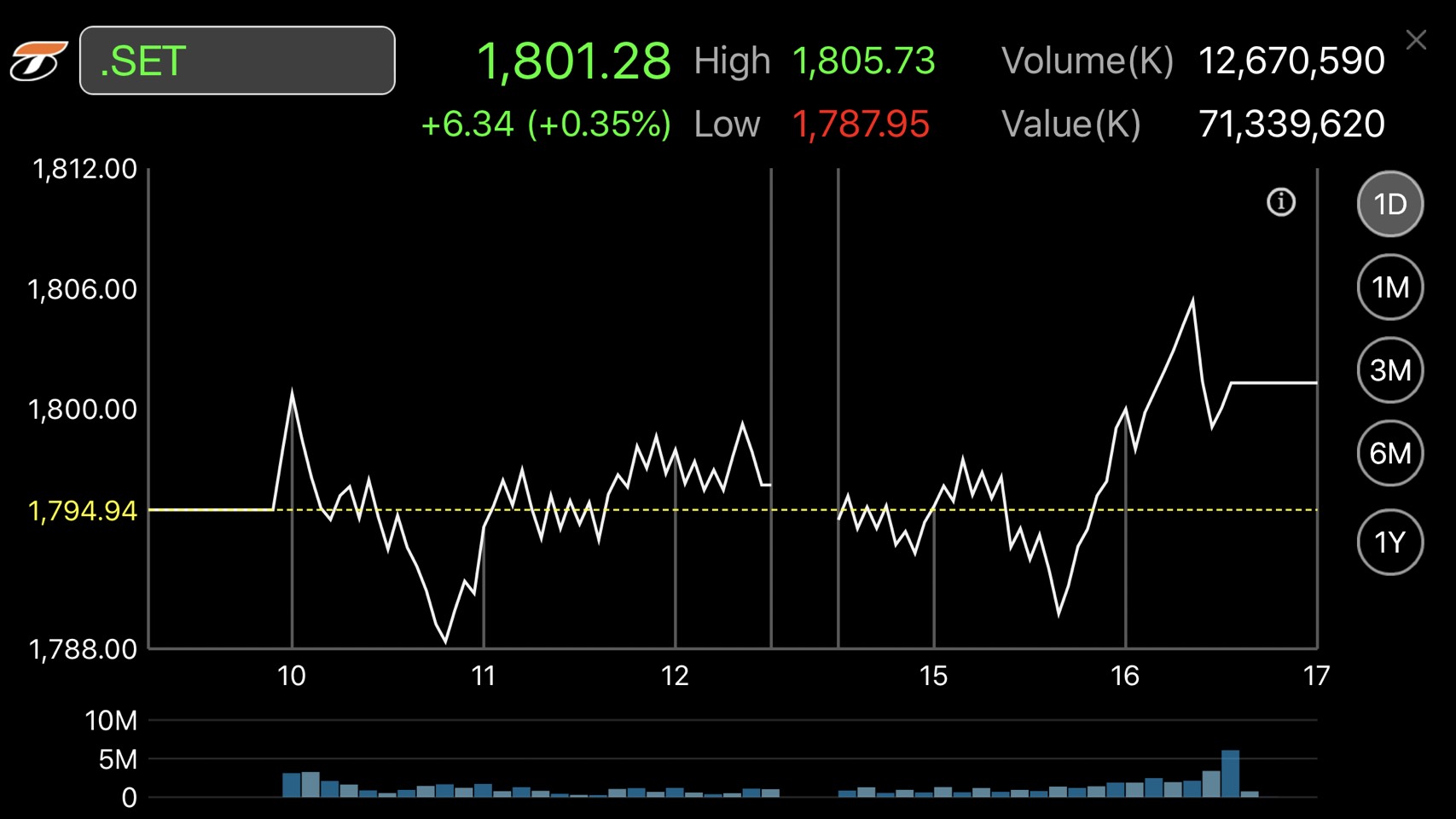 ผู้สื่อข่าวรายงานว่า การซื้อขายหุ้นวันนี้ ดัชนีหุ้นไทยเคลื่อนไหวทั้งในแดนบวก – ลบ โดยดัชนีฯแตะจุดสูงสุดที่ 1,805.73 จุด และแตะจุดต่ำสุดที่ระดับ 1,787.95 จุด