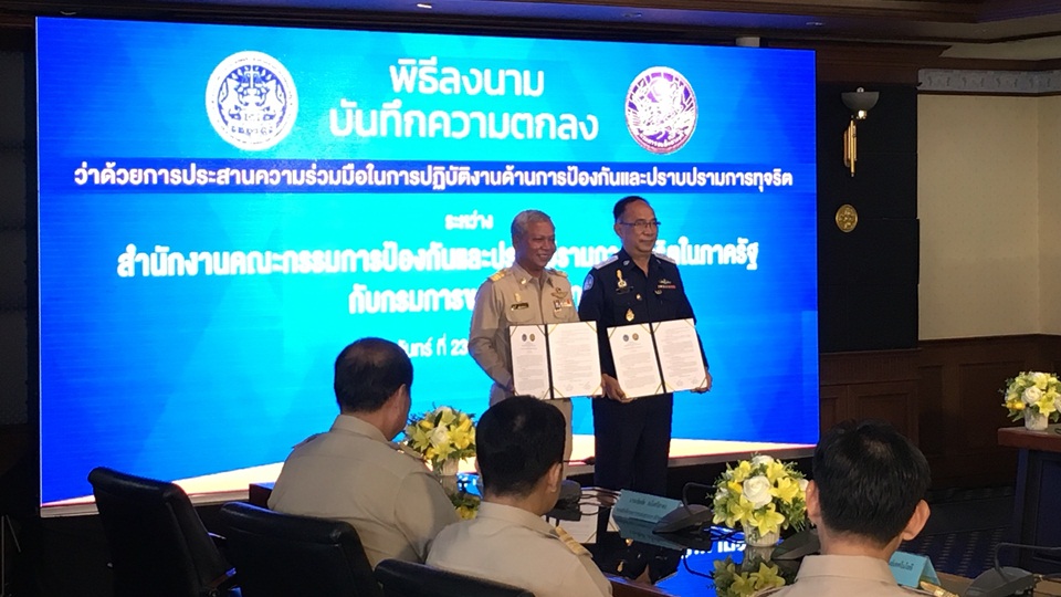 สำนักงานคณะกรรมการป้องกันและปราบปรามการทุจริตในภาครัฐ( ป.ป.ท. ) ร่วมกับ กรมการขนส่งทางบก จัดพิธีลงนามบันทึกความตกลงว่าด้วยการประสานความร่วมมือในการปฏิบัติงานด้านการป้องกันและปราบปรามการทุจริต ระหว่างสองหน่วยงาน โดยมีพันโท กรทิพย์ ดาโรจน์ เลขาธิการคณะกรรมการ ป.ป.ท. และนายสนิท พรหมวงษ์ อธิบดีกรมการขนส่งทางบก ร่วมลงนามครั้งนี้