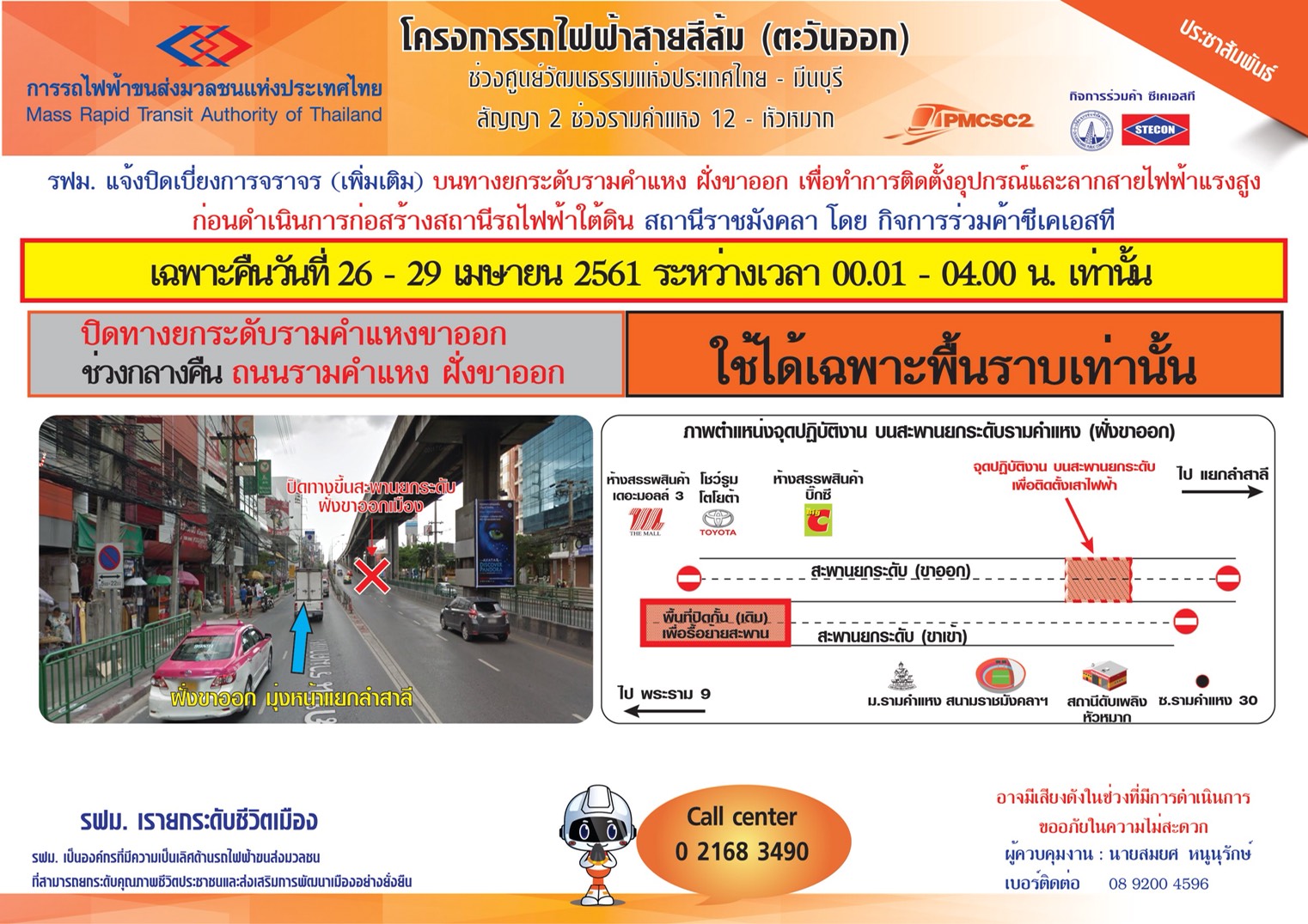 การรถไฟฟ้าขนส่งมวลชนแห่งประเทศไทย (รฟม.) แจ้งว่า กิจการร่วมค้า ซีเคเอสที ผู้รับจ้างก่อสร้างงานโยธาอุโมงค์ทางวิ่งและสถานีใต้ดิน โครงการรถไฟฟ้าสายสีส้ม (ตะวันออก) สัญญาที่ 2 ช่วงรามคำแหง 12 – หัวหมากร่วมกับการไฟฟ้านครหลวง (กฟน.) มีความจำเป็นต้องปิดการใช้งานทางยกระดับรามคำแหง ฝั่งขาออก เพื่อติดตั้งอุปกรณ์และลากสายไฟฟ้าแรงสูง โดยมีจุดปฏิบัติงานอยู่บนทางยกระดับ ฝั่งขาออก บริเวณหน้าสถานีดับเพลิงหัวหมาก วันที่ 26 – 29 เมษายน 2561 ระหว่างเวลา 00.01 – 04.00 น. ของทุกวัน โดยผู้ใช้เส้นทางถนนรามคำแหงขาออกใช้ได้เฉพาะพื้นราบเท่านั้น