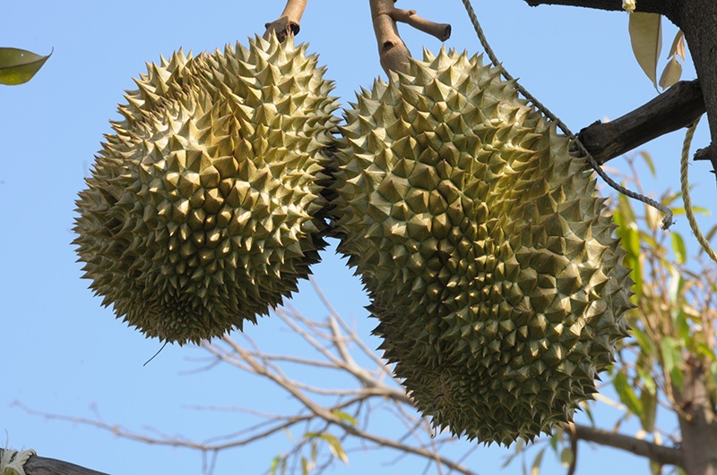 2. สังเกตหนาม ปลายหนามแห้ง มีสีน้ำตาลเข้ม เปราะและหักง่าย ดังนั้น เมื่อมองจากด้านบนของผลจะเห็นหนามเป็นสีเข้ม หนามกางออก ร่องหนามห่าง เวลาบีบหนามเข้าหากันจะรู้สึกว่ามีสปริง