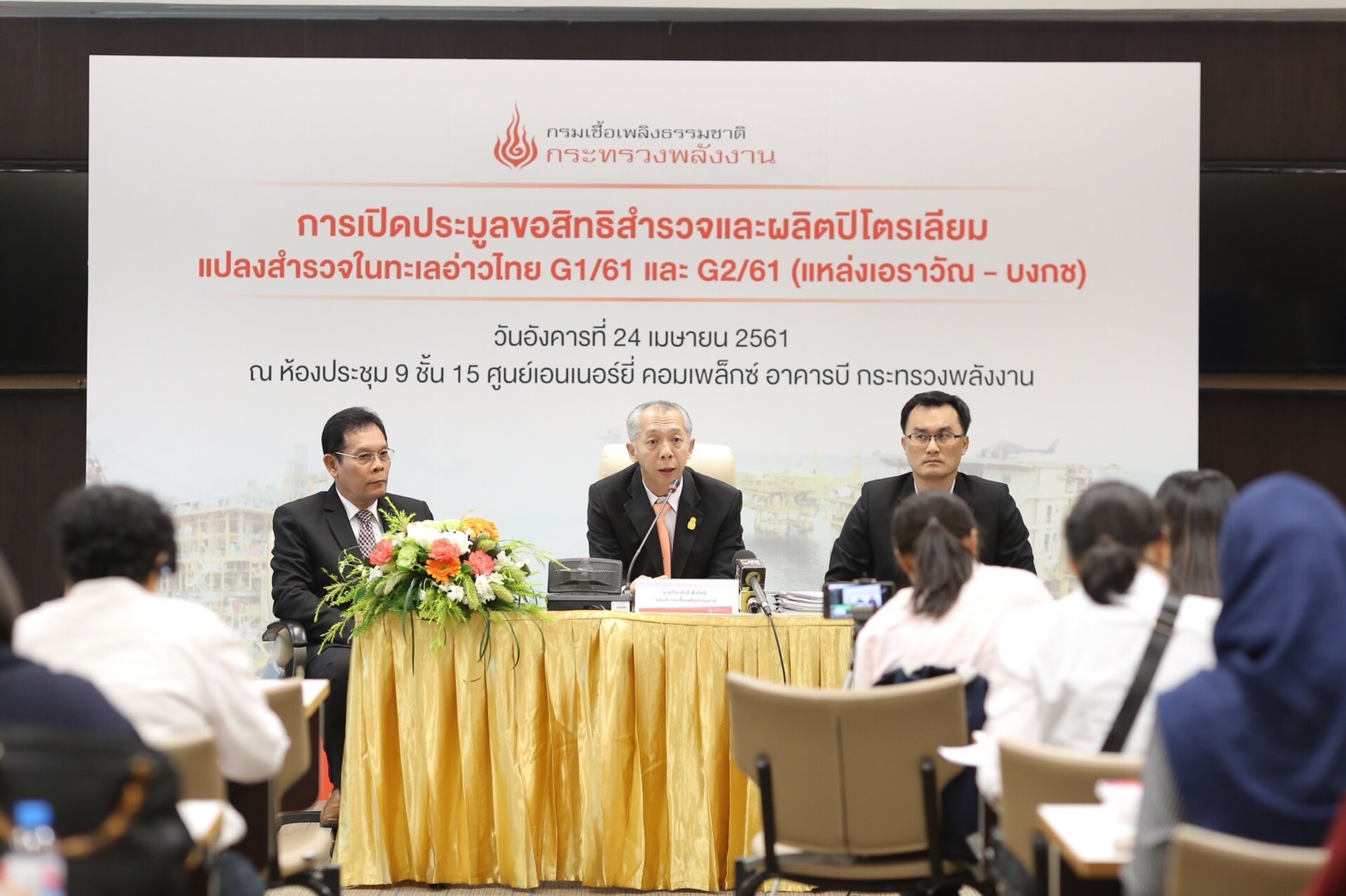 นายวีระศักดิ์ พึ่งรัศมี อธิบดีกรมเชื้อเพลิงธรรมชาติ แถลงว่า การเปิดประมูลแหล่งปิโตรเลียมในทะเลอ่าวไทยหมายเลข G1/61(เอราวัณ) และ G2/61 (บงกช) ตามทีโออาร์การเปิดประมูลภายใต้ระบบสัญญาแบ่งปันผลผลิต (Production Sharing Contract : PSC) ทางกระทรวงฯ ได้ให้ความสำคัญเรื่องความมั่นคงและค่าไฟฟ้าต่ำสุด จึงกำหนดข้อเสนอการพิจารณาการให้คะแนนราคาก๊าซฯ ในอัตราที่ไม่สูงกว่าราคาปัจจุบันเป็นสัดส่วนคะแนนร้อยละ 65 และที่เหลือร้อยละ 25 พิจารณาจากข้อเสนอส่วนแบ่งกำไรอีกร้อยละ 10 พิจารณาจากข้อเสนออื่น ๆ ขณะที่ข้อกำหนดด้านความมั่นคงได้กำหนดให้ผู้ผลิตรายใหม่ผลิตก๊าซฯจาก 2 แหล่งรวมกัน ณ วันที่เริ่มสัญญาในปี 2565-2566 ที่ 1,500 ล้านลูกบาศก์ฟุตต่อวัน เป็นเวลา 10 ปี จากที่ปัจจุบันกำลังผลิตจาก 2 แหล่ง รวมกันอยู่ที่ 2,100 ล้านลูกบาศก์ฟุตต่อวัน