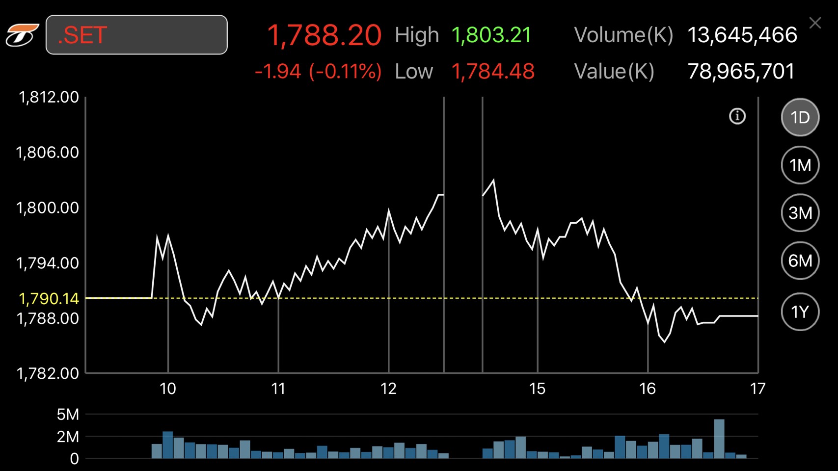 ผู้สื่อข่าวรายงานว่าดัชนีตลาดหลักทรัพย์ฯ ปิดวันนี้ (24 เม.ย.) ที่ระดับ 1,788.20 จุด ลดลง 1.94 จุด หรือร้อยละ 0.11 มูลค่าการซื้อขาย 78,965.70 ล้านบาท การซื้อขายหุ้นวันนี้ ดัชนีหุ้นไทยเคลื่อนไหวทั้งแดนบวก-ลบ โดยดัชนีฯ แตะจุดสูงสุดที่ 1,803.21จุด และแตะจุดต่ำสุดที่ระดับ 1,784.48 จุด