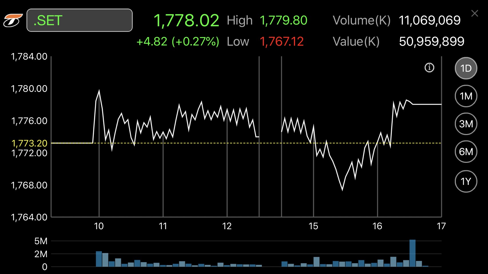 ผู้สื่อข่าวรายงานว่าดัชนีตลาดหลักทรัพย์ฯ ปิดที่ระดับ 1,778.02 จุด เพิ่มขึ้น 4.82 จุด หรือร้อยละ 0.27มูลค่าการซื้อขาย 50,959.90 ล้านบาท การซื้อขายหุ้นวันนี้ (27 เม.ย.) ดัชนีหุ้นไทยเคลื่อนไหวในแดนบวก-ลบ โดยดัชนีฯ แตะจุดสูงสุดที่ 1,779.80 จุด และต่ำสุดที่ระดับ 1,767.12 จุด