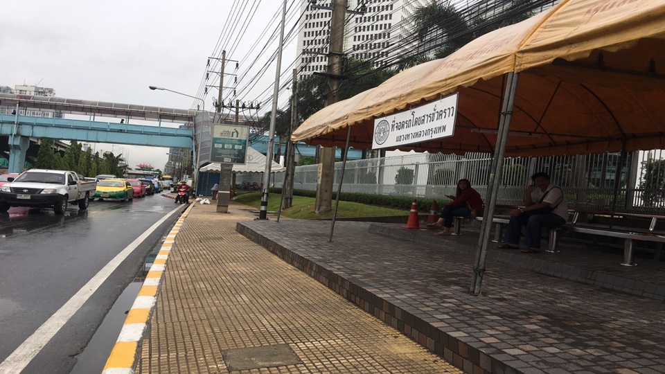 โดยเจ้าหน้าที่แขวงทางหลวงกรุงเทพได้กางเต้นท์ผ้าใบชั่วคราว 2 หลัง และวางม้านั่งไม้ทำเป็นศาลาพักผู้โดยสารชั่วคราวแทน พร้อมเทปูนทับหลุมเสาศาลาเพื่อความปลอดภัย ก่อนรอดำเนินการจัดทำที่พักป้ายรถโดยสารใหม่ต่อไป ทั้งนี้ยังมีประชาชนใช้บริการนั่งพักคอยรถโดยสารตลอดเวลา