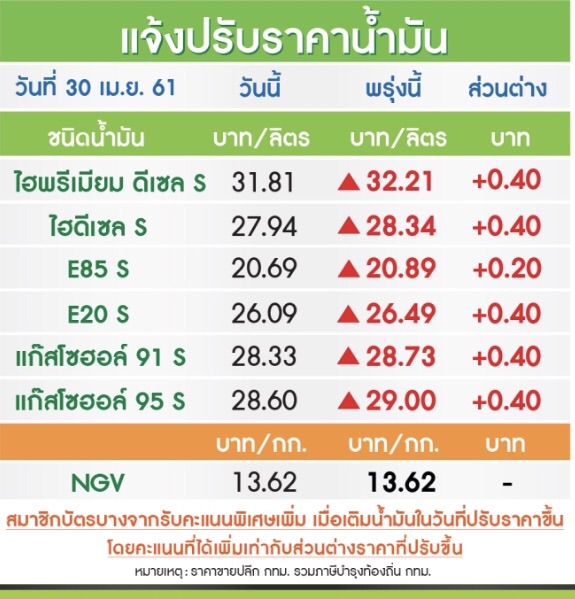 กรุงเทพฯ 30 เม.ย. – ปตท.-บางจากฯ ปรับขึ้นราคาน้ำมันทุกชนิด 40 สต. ยกเว้น E85 ขึ้น 20 สตางค์ มีผล 1 พ.ค.นี้