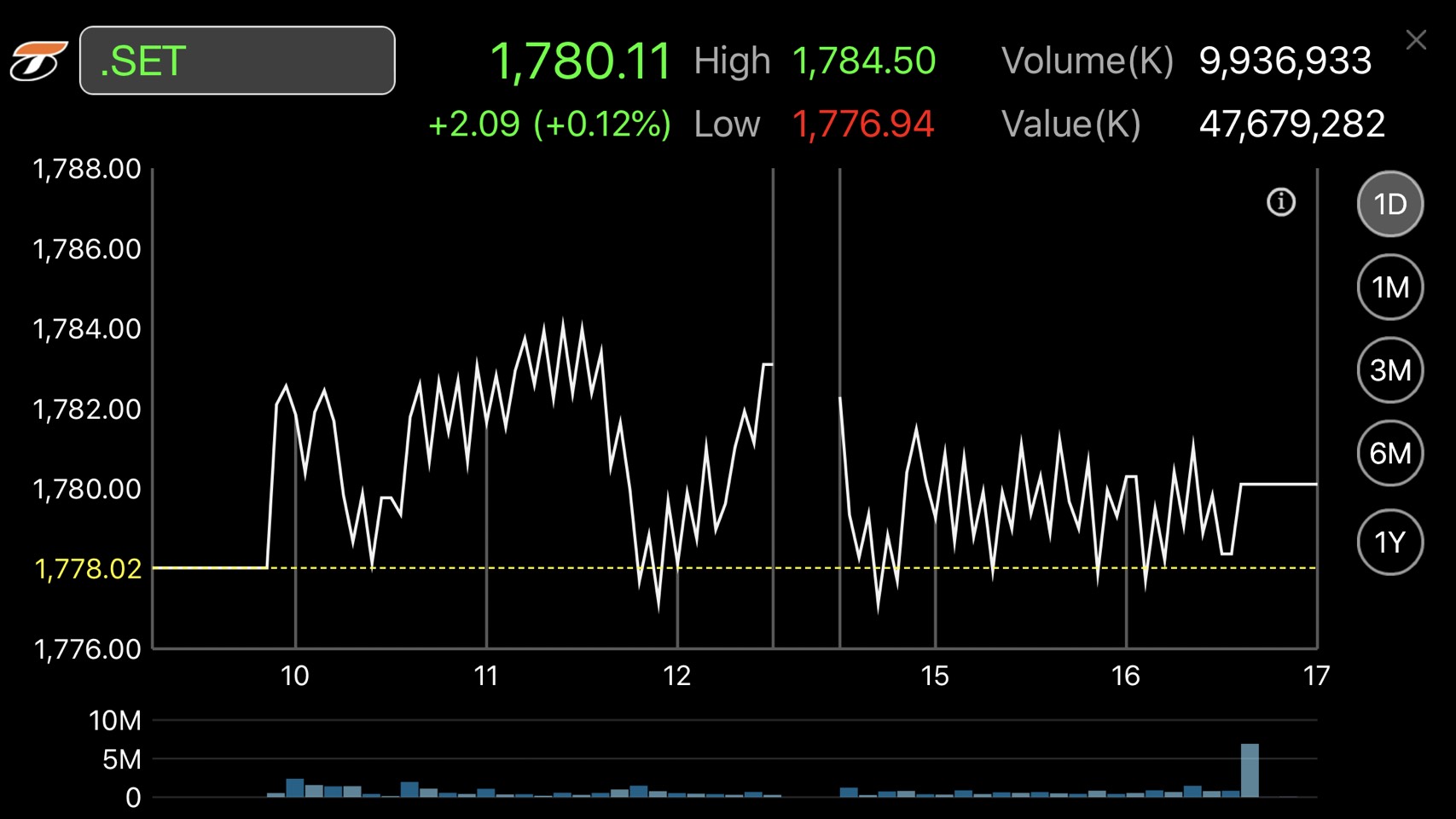 ผู้สื่อข่าวรายงานว่าดัชนีตลาดหลักทรัพย์ฯ ปิดที่ระดับ 1,780.11 จุด เพิ่มขึ้น 2.09 จุด หรือร้อยละ 0.12 มูลค่าการซื้อขาย 47,679.28 ล้านบาท การซื้อขายหุ้นวันนี้ (30 เม.ย.) ดัชนีหุ้นไทยเคลื่อนไหวทั้งแดนบวก-ลบ โดยดัชนีฯ แตะจุดสูงสุดที่ 1,784.50 จุด และต่ำสุดที่ระดับ 1,776.94 จุด