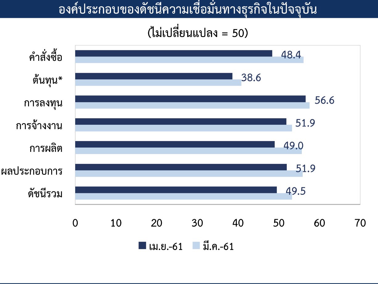 ธนาคารแห่งประเทศไทย เปิดเผยดัชนีความเชื่อมั่นทางธุรกิจในเดือนเมษายน 2561 ดัชนีฯ ลดลงจากเดือนก่อนจาก ระดับ 53.3 มาอยู่ที่ระดับ 49.5 โดยเป็นการปรับลดลงในทุก องค์ประกอบ ผู้ประกอบการในภาคการผลิตมีความเชื่อมั่นลดลง ในด้านการผลิตและคำสั่งซื้อโดยเฉพาะในธุรกิจผลิตเครื่องใช้ไฟฟ้า และอุปกรณ์ และธุรกิจผลิตชิ้นส่วนอิเล็กทรอนิกส์ สาเหตุหลักจาก จานวนวันทำการที่น้อยเนื่องจากเป็นช่วงเทศกาลสงกรานต์ ประกอบ กับความเชื่อมั่นของผู้ประกอบการในภาคการค้าปรับลดลงหลังจากมี การเร่งซื้อในเดือนก่อนหน้า