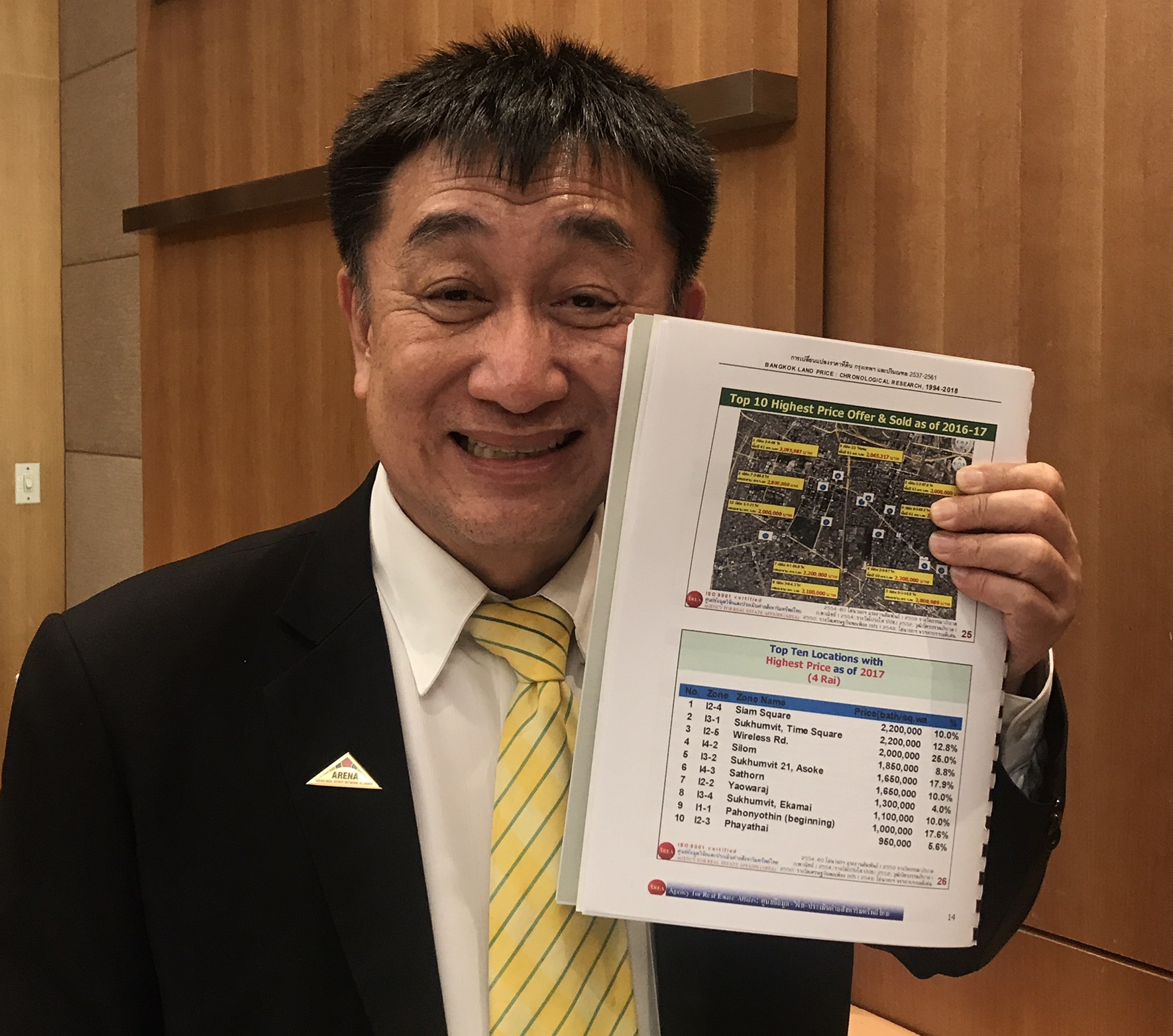 นายโสภณ พรโชคชัย ประธานกรรมการบริหารศูนย์ข้อมูลวิจัยและประเมินค่าอสังหาริมทรัพย์ไทย บจก.เอเจนซี่ ฟอร์ เรียลเอสเตท แอฟร์ส เปิดเผยผลสำรวจราคาที่ดินกรุงเทพฯ และปริมณฑล ปี 2561 พบว่าราคาขยับขึ้นร้อยละ 5.3 นับเป็นราคาที่ขยับขึ้นมาสูงสุดของช่วงการทำงานของรัฐบาลชุดนี้ ซึ่งไม่ได้เกิดจากภาวะเศรษฐกิจ แต่เกิดจากการลงทุนรถไฟฟ้าที่ล่าสุดมีถึง 124 สถานีแล้ว อย่างไรก็ตาม ราคาที่ดินในกรุงเทพฯ เขตในตามแนวรถไฟฟ้าบีทีเอสเพิ่มขึ้นกว่าค่าเฉลี่ย โดยย่านถนนวิทยุเพิ่มขึ้นสูงสุดถึงร้อยละ 25 ราคาตารางวาละ 2 ล้านบาท ซึ่งส่วนหนึ่งเป็นผลมาจากการขายที่ดินราคาสูงของสถานทูตอังกฤษ