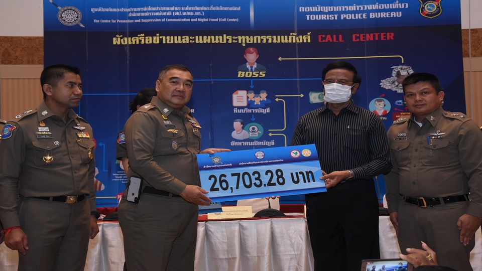 พล.ต.อ.ธนิตศักดิ์ ธีระสวัสดิ์ ที่ปรึกษาพิเศษ สำนักงานตำรวจแห่งชาติ /พล.ต.ต.สุรเชษฐ์ หักพาล รองผู้บัญชาการตำรวจท่องเที่ยว พร้อมเจ้าหน้าที่ตำรวจและหน่วยงานที่เกี่ยวข้อง แถลงข่าวมาตรการช่วยเหลือและบรรเทาความเดือนร้อนของประชาชน ครั้งที่ 14 จำนวน 4 ราย เป็นเงินกว่า 1,166,000 บาท หลังถูกแก็งค์คอลเซ็นเตอร์ โทรศัพท์หลอกลวงเป็นบุคคลอื่น ให้หลงเชื่อ เพื่อโอนเงินมาให้ มีผู้เสียหายจำนวนมากหลงเชื่อ ซึ่งที่ผ่านมาสามารถอายัดเงินคืนให้แก่ผู้เสียหายได้ 97 ราย มูลค่ารวมกว่า 18 ล้านบาท