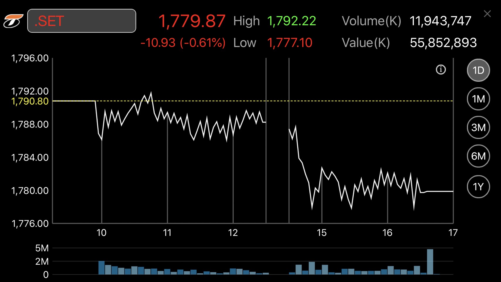 ผู้สื่อข่าวรายงานว่าดัชนีตลาดหลักทรัพย์ฯ ปิดที่ระดับ 1,779.87 จุด ลดลง 10.93 จุด หรือร้อยละ0.61 มูลค่าการซื้อขาย 55,852.89 ล้านบาท การซื้อขายหุ้นวันนี้ (4 พ.ค.) ดัชนีหุ้นไทยแกว่งตัวลดลง โดยดัชนีฯแตะจุดสูงสุดที่ 1,792.22 จุด และแตะจุดต่ำสุดที่ระดับ 1,777.10 จุด