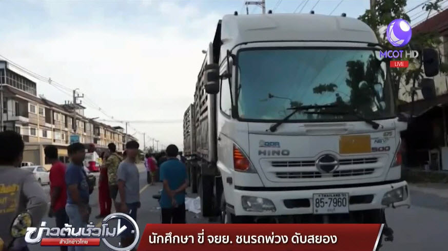 ชลบุรี 6 พ.ค.-นักศึกษา ปวช.ปี 3 ขี่รถจักรยานยนต์เฉี่ยวชนกับรถบรรทุกพ่วง 22 ล้อ บนถนนพานทอง-บ้านบึง จ.ชลบุรี ถูกล้อทับร่างเสียชีวิต