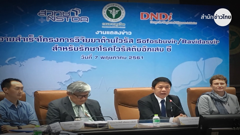 นพ.สุวรรณชัย วัฒนายิ่งเจริญชัย อธิบดีกรมควบคุมโรค กระทรวงสาธารณสุข (สธ.) พร้อมด้วย ศ.นพ.ประสิทธิ์ ผลิตผลการพิมพ์ รักษาการรองผู้อำนวยการสำนักงานพัฒนาวิทยาศาสตร์และเทคโนโลยีแห่งชาติ (สวทช.) พญ.อิซาเบล ออนดิเยอ-เมแยร์ หัวหน้าโครงการวิจัยทางคลินิกด้านเอชไอวีและไวรัสตับอักเสบ ซี องค์กรเพื่อการริเริ่มจัดหายาสำหรับโรคที่ถูกละเลย (Drugs for Neglected Diseases initiative, DNDi) รศ.พญ.อัญชลี อวิหิงสานนท์ ศูนย์วิจัยโรคเอดส์ สภากาชาดไทย (HIV-NAT) และนายเฉลิมศักดิ์ กิตติตระกูล มูลนิธิเข้าถึงเอดส์ ร่วมแถลงข่าว “ความสำเร็จโครงการวิจัยยาต้านไวรัส Sofosbuvir+Ravidasvir สำหรับรักษาโรคไวรัสตับอักเสบ ซี”