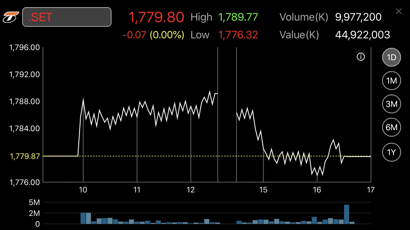 ผู้สื่อข่าวรายงานว่า การซื้อขายหุ้นวันนี้ ดัชนีหุ้นไทยผันผวน หลังช่วงบ่ายมีแรงขายทำกำไร โดยดัชนีฯแตะจุดสูงสุดที่ 1,789.77 จุด และแตะจุดต่ำสุดที่ระดับ 1,776.32 จุด