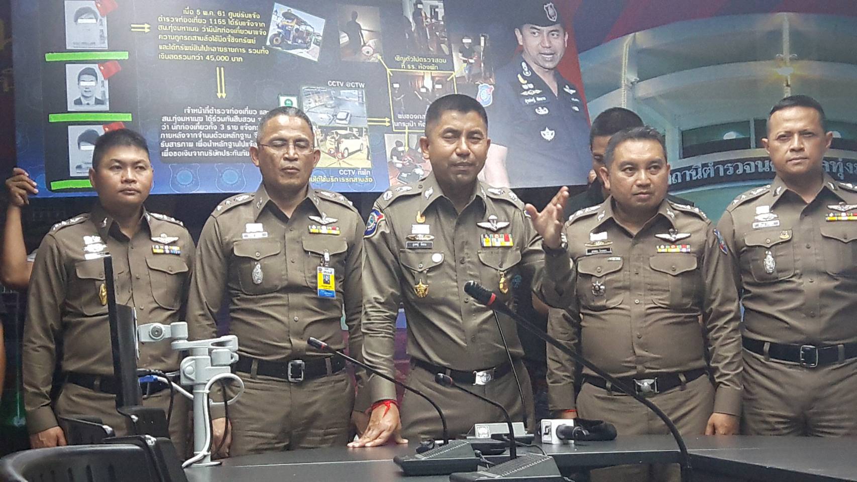 พล.ต.ต.สุรเชรษฐ์ หักพาล รองผู้บัญชาการตำรวจท่องเที่ยว เข้าสอบปากคำนักท่องเที่ยวชาวจีนฮ่องกง 3 คน หลังอ้างว่าถูกคนขับรถตุ๊กตุ๊กใช้อาวุธมีดจี้ชิงทรัพย์ ทั้งโทรศัพท์มือถือไอโฟน 3 เครื่อง กล้องถ่ายรูป 2 กล้อง และเงินสดรวม 45,000 บาท ระหว่างเดินทางจากหน้าห้าง สรรพสินค้าเซ็นทรัลเวิลด์ กลับไปยังโรงแรมย่านถนนศาลาแดง และเข้าแจ้งความ สน.ทุ่งมหาเมฆ เมื่อวันที่ 5 พฤษภาคมที่ผ่านมา โดยระหว่างสอบปากคำพบพิรุธหลายอย่าง และให้การไม่ตรงกัน ตำรวจจึงตรวจสอบภาพจากกล้องวงจรปิด กลับพบว่า นักท่องเที่ยวทั้ง 3 คน ไม่ได้เดินไปขึ้นรถตุ๊กตุ๊ก ตามที่กล่าวอ้าง แต่ขึ้นรถยาริสสีขาวที่มาจอดรอรับอยู่บริเวณหน้าห้าง ซึ่งเป็นรถรับจ้างส่วนบุคคล พาไปส่งยังโรงแรมโดยปลอดภัย สอดคล้องกับภาพวงจรปิดของโรงแรมฯ ซึ่งปรากฏภาพนักท่องเที่ยวเดินลงจากรถเข้าไปภายในโรงแรมฯ พร้อมทรัพย์สินที่กล่าวอ้างว่าถูกจี้ชิงทรัพย์ไปด้วย