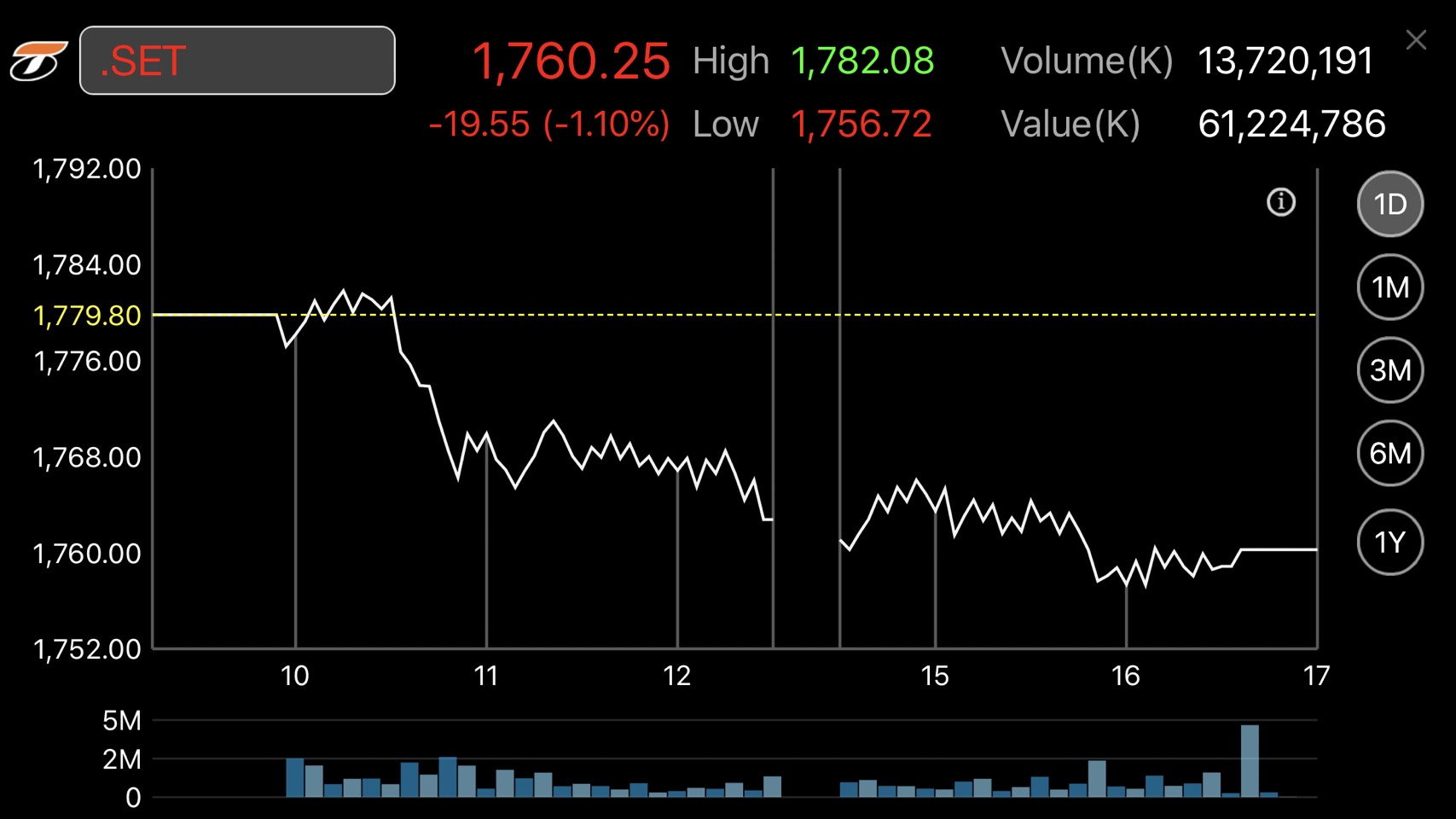 ผู้สื่อข่าวรายงานว่าดัชนีตลาดหลักทรัพย์ฯ ปิดที่ระดับ 1,760.25 จุด ลดลง 19.55 จุด หรือร้อยละ 1.10มูลค่าการซื้อขาย 61,224.79 ล้านบาท การซื้อขายหุ้นวันนี้ (8 พ.ค.) ดัชนีหุ้นไทยถูกแรงขายทำกำไร โดยดัชนีฯ แตะจุดสูงสุดที่ 1,782.08 จุด และต่ำสุดที่ระดับ 1,756.72 จุด
