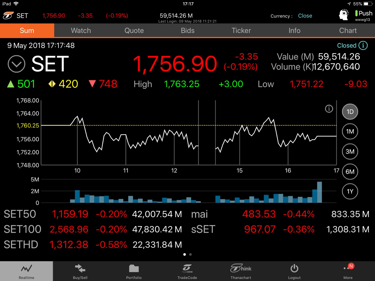 ตลาดหลักทรัพย์แห่งประเทศไทย 9 พ.ค. – ตลาดหลักทรัพย์ปิดวันนี้ที่ระดับ 1,756.90 จุด ลดลง 3.35 จุด (-0.19%) มูลค่าการซื้อขาย 59,514.26 ล้านบาท