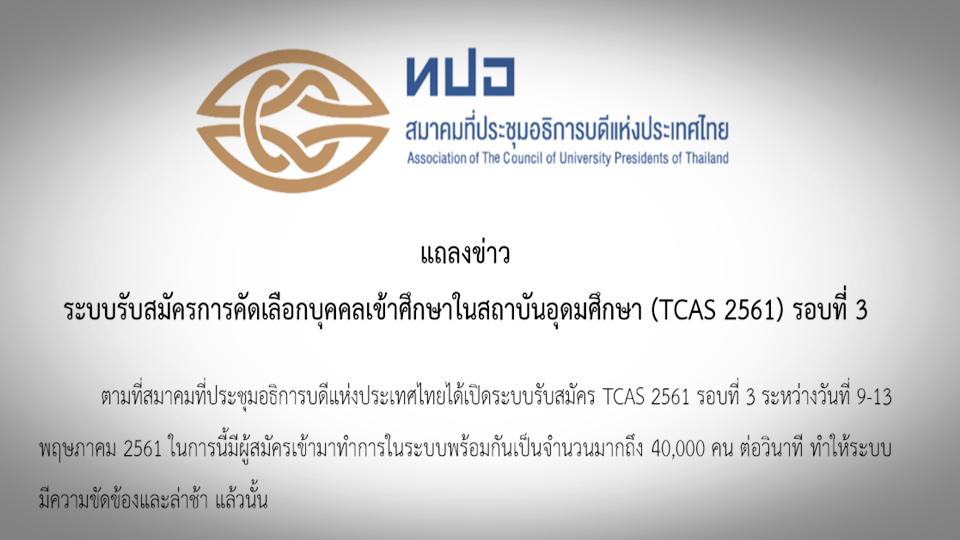 สมาคมที่ประชุมอธิการบดีแห่งประเทศไทย ออกเอกสารแถลงข่าววันนี้ (10พ.ค.) ระบุว่า ตามที่สมาคมที่ประชุมอธิการบดีแห่งประเทศไทย ได้เปิดระบบรับสมัครTCAS 2561 รอบที่3ระหว่างวันที่ 9-13 พ.ค.2561 ในการนี้มีผู้สมัครเข้ามาทำการในระบบพร้อมกันเป็นจำนวนมากถึง 40,000 คน ต่อวินาที ทำให้ระบบมีความขัดข้องและล่าช้าแล้วนั้น