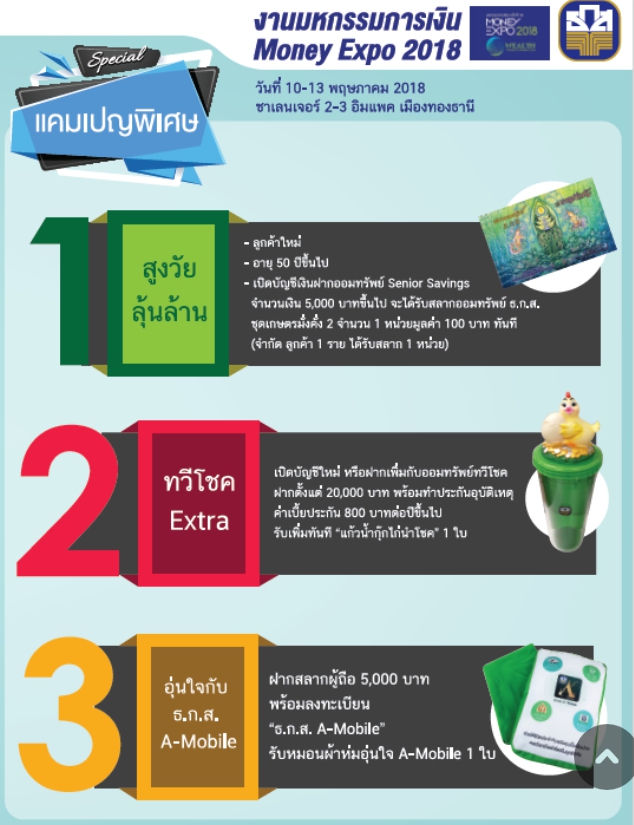 นายนิพัฒน์ เกื้อสกุล ผู้ช่วยผู้จัดการ ธนาคารเพื่อการเกษตรและสหกรณ์การเกษตร (ธ.ก.ส.) เปิดเผยว่า ในงานมหกรรมการเงิน ครั้งที่ 18 Money Expo 2018 ธ.ก.ส.ได้นำเสนอผลิตภัณฑ์และบริการทางการเงิน โดยจำลองรูปแบบสาขาของธนาคารในอนาคต เน้นความเป็น Smart Office ที่ทันสมัย ประหยัดพลังงาน ภายใต้แนวคิด “BAAC Smart Office and Happiness Society” พร้อมทั้งการให้บริการทางการเงินที่ทันสมัย ผ่าน Application “ธ.ก.ส. A-Mobile” เพื่อตอบโจทย์ทุก Life Style ของลูกค้าในยุคดิจิทัล อีกทั้งนำสินค้าเอสเอ็มอีเกษตร ระดับ Premium มาจำหน่าย ภายใต้ชื่อ “A-Shop” เพื่อให้คนเมืองได้ร่วมสนับสนุนสินค้าชุมชนที่ได้มาตรฐาน ตลอดจนนำเสนอรูปแบบการท่องเที่ยว วิถีชุมชนในลักษณะ Travel Corner เพื่อส่งเสริมเศรษฐกิจชุมชนให้เกิดรายได้ที่ยั่งยืน นำไปสู่การสร้าง “ชุมชนอุดมสุข (Happiness Society)”