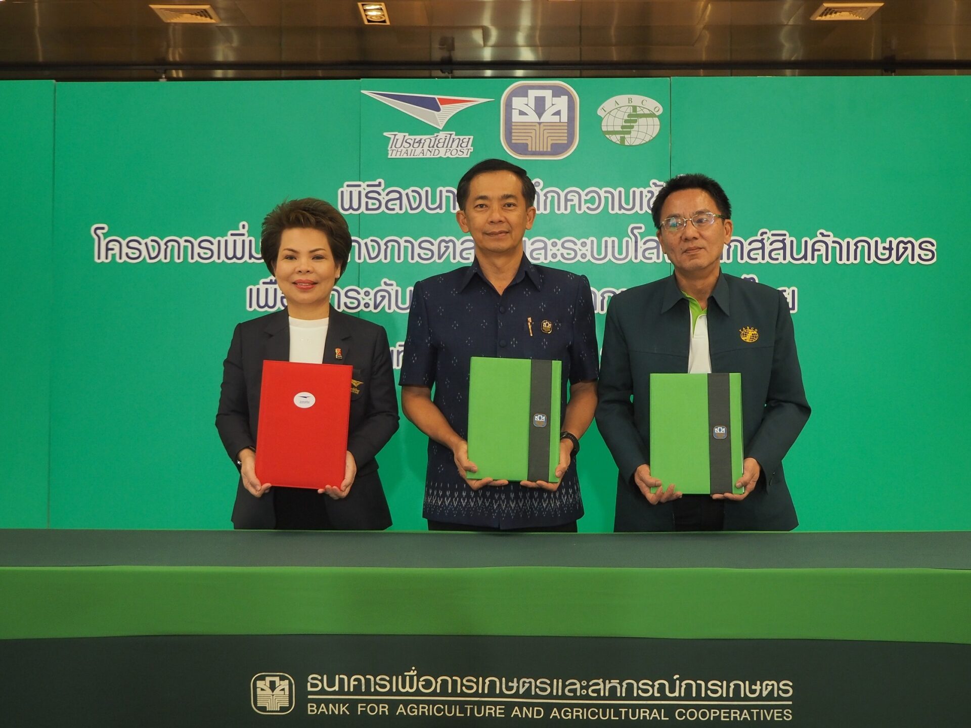 นายอภิรมย์ สุขประเสริฐ ผู้จัดการ ธนาคารเพื่อการเกษตรและสหกรณ์การเกษตร (ธ.ก.ส.) และนางสมร เทิดธรรมพิบูล กรรมการผู้จัดการใหญ่ บริษัท ไปรษณีย์ไทย จำกัด ลงนามบันทึกความเข้าใจ “โครงการเพิ่มช่องทางการตลาดและระบบโลจิสติกส์สินค้าเกษตรเพื่อกระดับเศรษฐกิจภาคการเกษตรไทย”